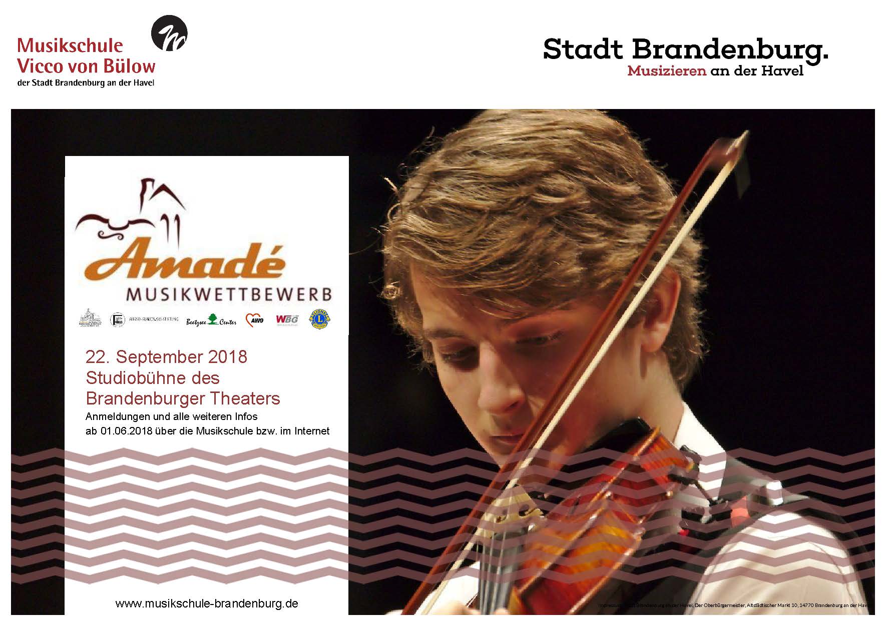 Vom 01.06.2018 bis 31.08.2018 können sich interessierte Brandenburgerinnen und Brandenburger, Musikschülerinnen und Musikschüler anmelden. Die Unterlagen sind beim Fachbereich Kultur der Stadtverwaltung im Gotischen Haus am Johanniskirchplatz 4, bei der Musikschule in der GuthsMuths-straße 23 oder über die Internetseite www.musikschule-brandenburg.de/projekte/amade-musikwettbewerb-2018 erhältlich.