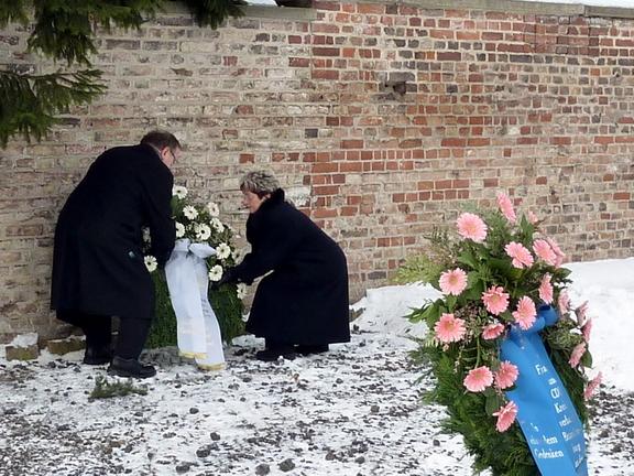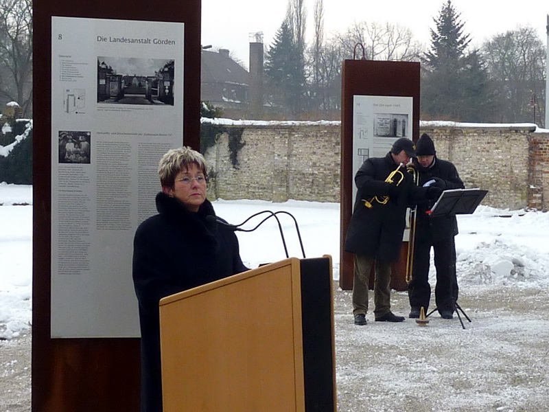 Bevor die Kränze niedergelegt wurden hielten Klaus Windeck, Mitglied des Präsidiums der Stadtverordnetenversammlung, und Oberbürgermeisterin Dr. Dietlind Tiemann vor ca. 120 Brandenburgerinnen und Brandenburgern Gedenkreden. Antonia Wünschmann und Jobst van Lessen, Schüler des von-Saldern-Gymnasiums, schilderten ihre Gedanken an die Opfer des Nationalsozialismus und für die musikalische Begleitung sorgten trotz der klirrenden Kälte Martin Sander und Hilfried Hoyer, Mitglieder der Brandenburger Symphoniker.