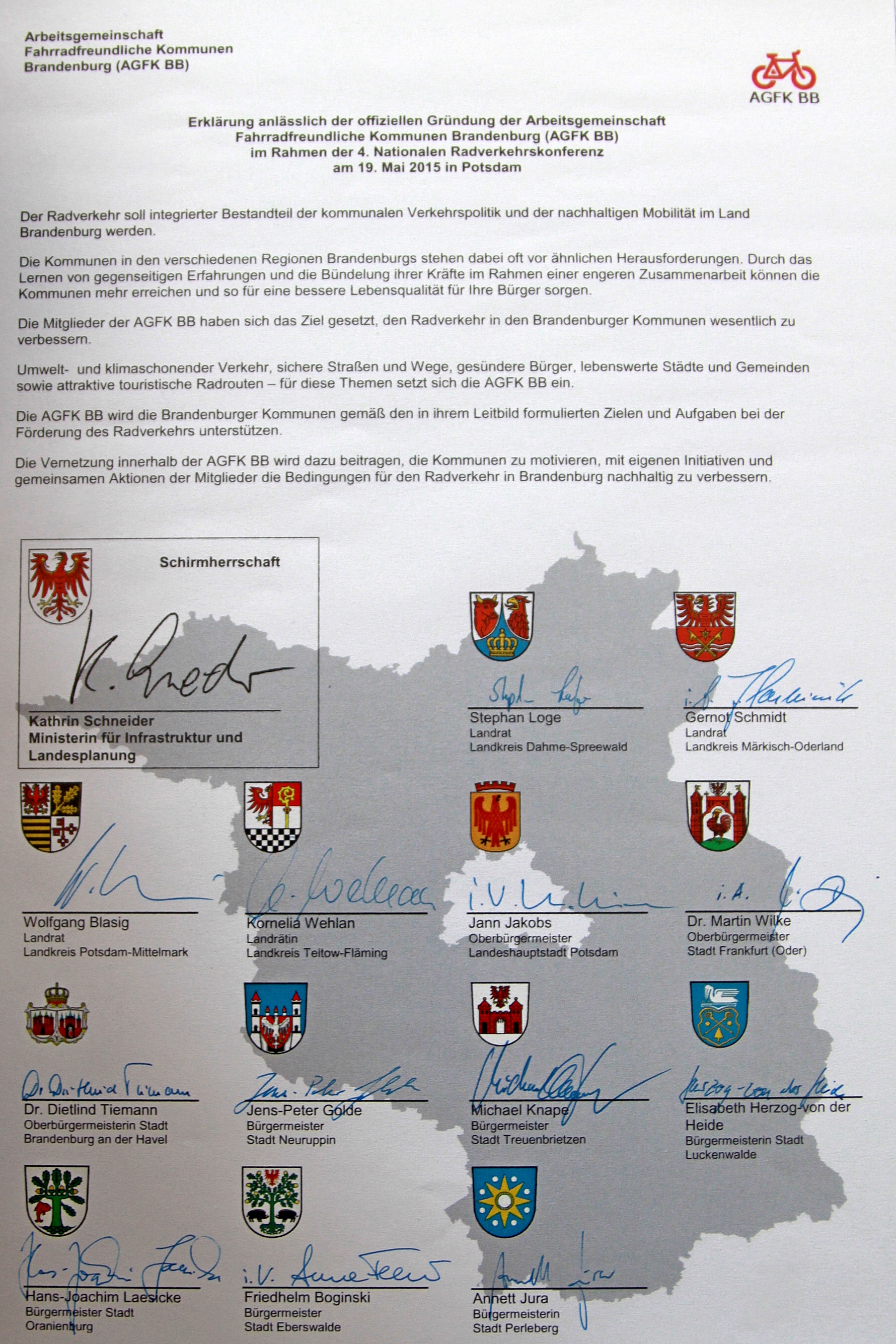Am Dienstag, 20.05.2015, haben neben Brandenburg an der Havel zwölf weitere Kommunen und Landkreise die Absicht erklärt, in der "Arbeitsgemeinschaft Fahrradfreundliche Kommunen des Landes Brandenburg“ zusammen zu arbeiten.