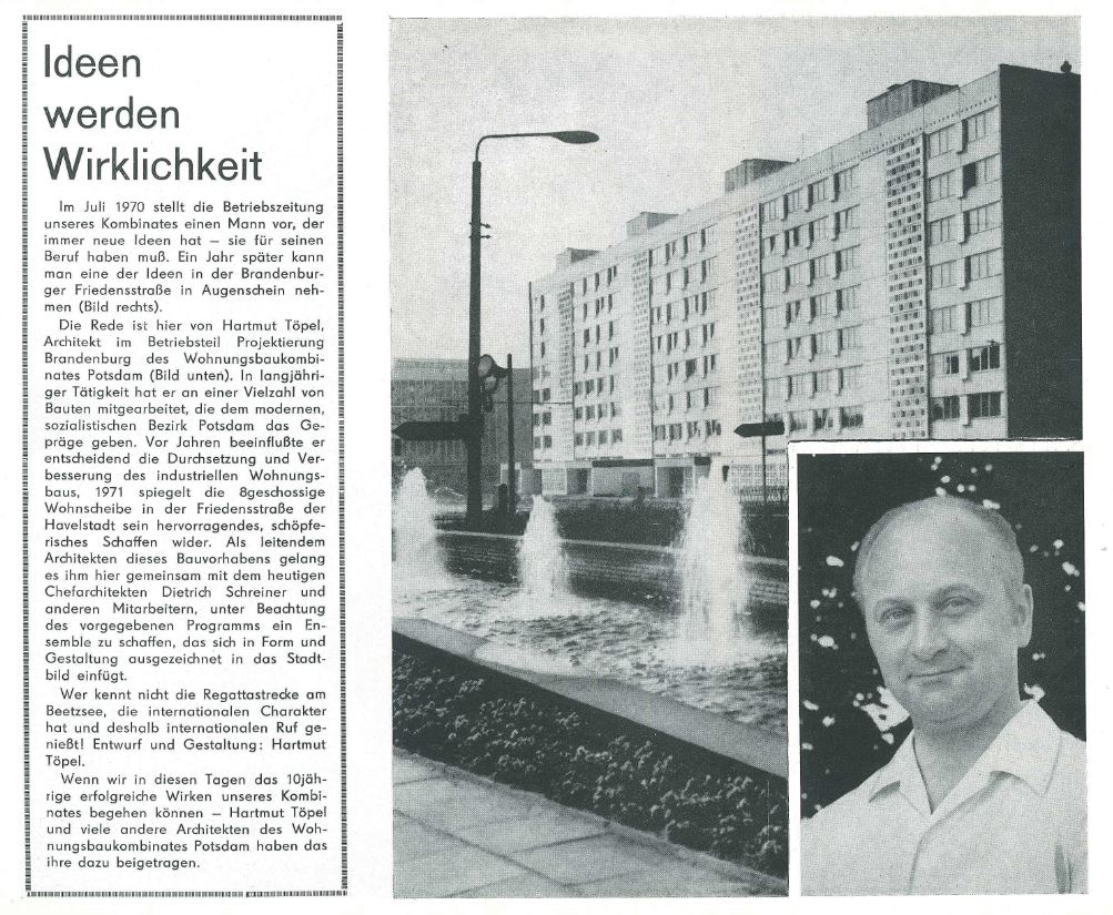 Hartmut Töpel wurde oft als „Vater“ der Regattastrecke Beetzsee bezeichnet. Am 15. Oktober 2020 ist der bekannte Brandenburger Architekt jetzt im Alter von 87 Jahren verstorben. In einem Kondolenzschreiben an die Witwe, in dem Oberbürgermeister Steffen Scheller das Wirken des Verstorbenen gewürdigt hat, heißt es unter anderem: „Mit Hartmut Töpel hat Brandenburg an der Havel einen verdienstvollen Einwohner verloren, der als Architekt bleibende Spuren in seiner Heimatstadt hinterlassen hat. Für immer verbunden ist mit seinem Namen insbesondere unsere wunderschöne Naturregattastrecke Beetzsee. Sie entstand Ende der 1960er Jahre nach seinen Plänen und genießt heute als Austragungsort wichtiger internationaler Meisterschaften weltweit einen hervorragenden Ruf.“