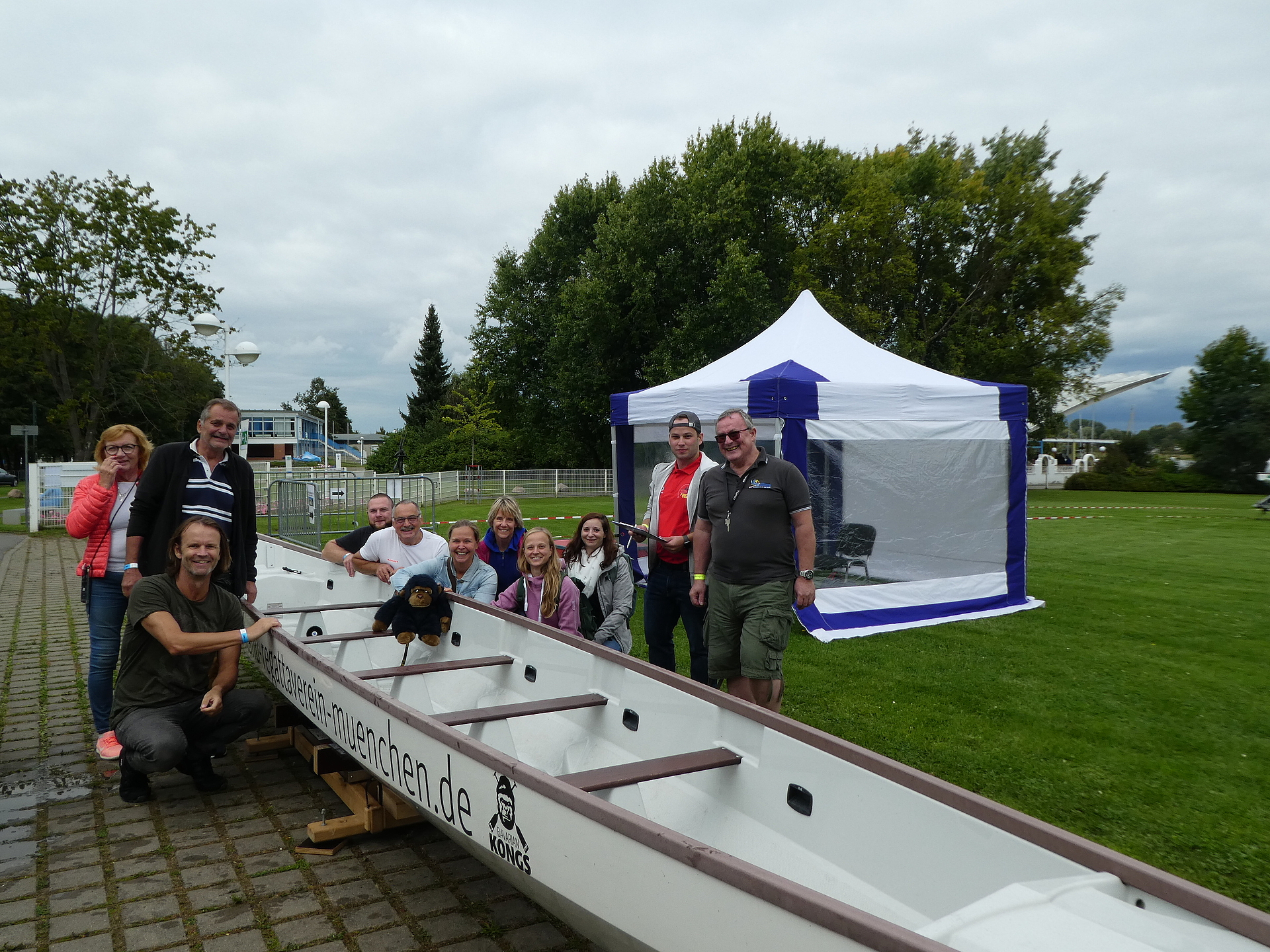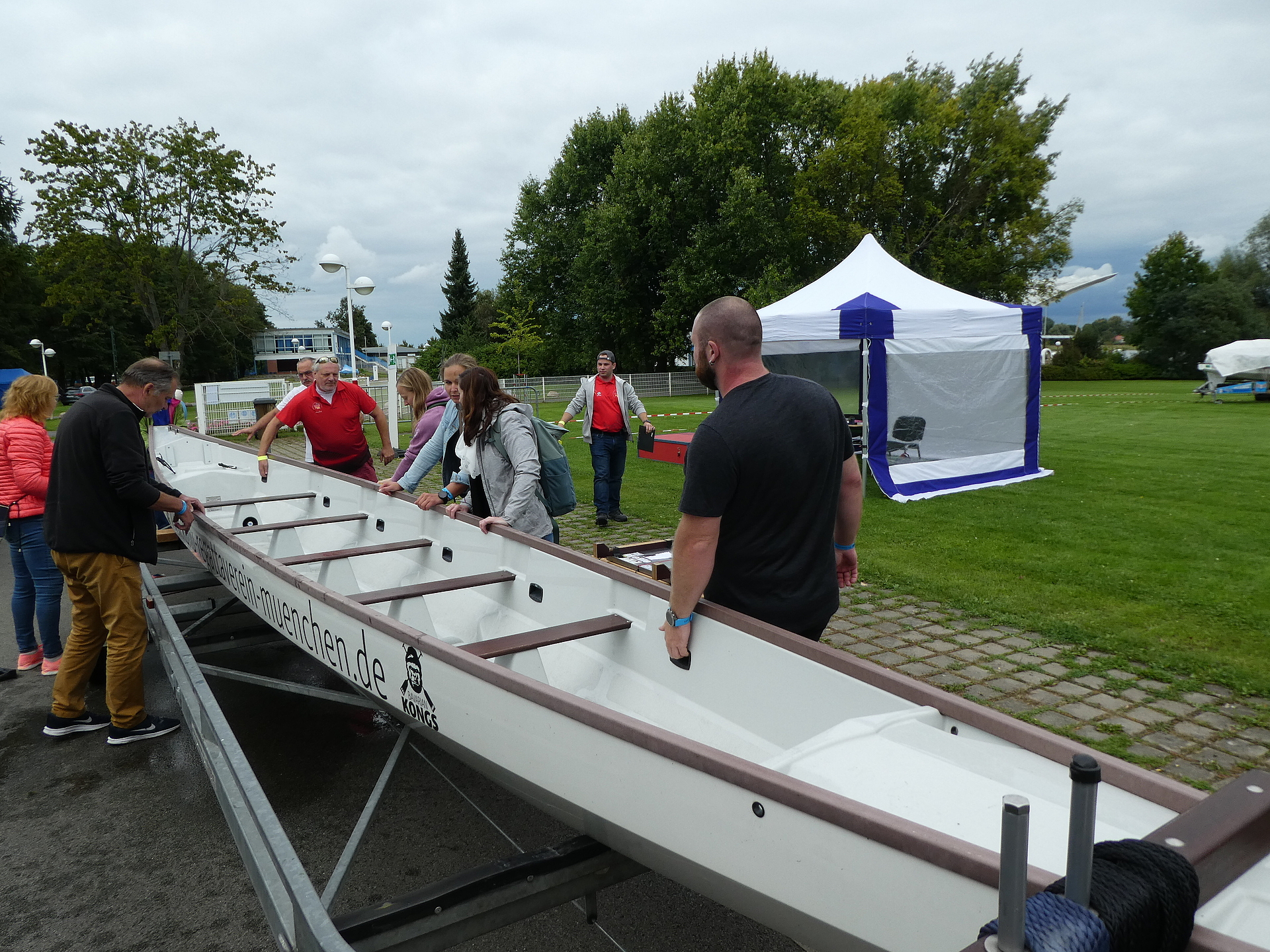 Zu den ersten Teams, die den Weg nach Brandenburg an der Havel zu den diesjährigen Deutschen Drachenbootmeisterschaften geschafft haben, zählt die Mannschaft des Kanu-Regattavereins München. Am Donnerstag, 16.09.2021, trafen die 12 Frauen und Männer der „BAVARIAN KONGS“ auf dem Gelände der Regattastrecke Beetzsee ein. Nach einer 6-stündigen, von heftigen Regenschauern begleiteten Fahrt, wurde das Drachenboot gegen 16:00 Uhr auf dem Sattelplatz vom Hänger abgeladen und anschließend gewogen, damit in den kommenden Tagen bei den Rennen um die begehrten Meistertitel alles mit rechten Dingen zugeht.