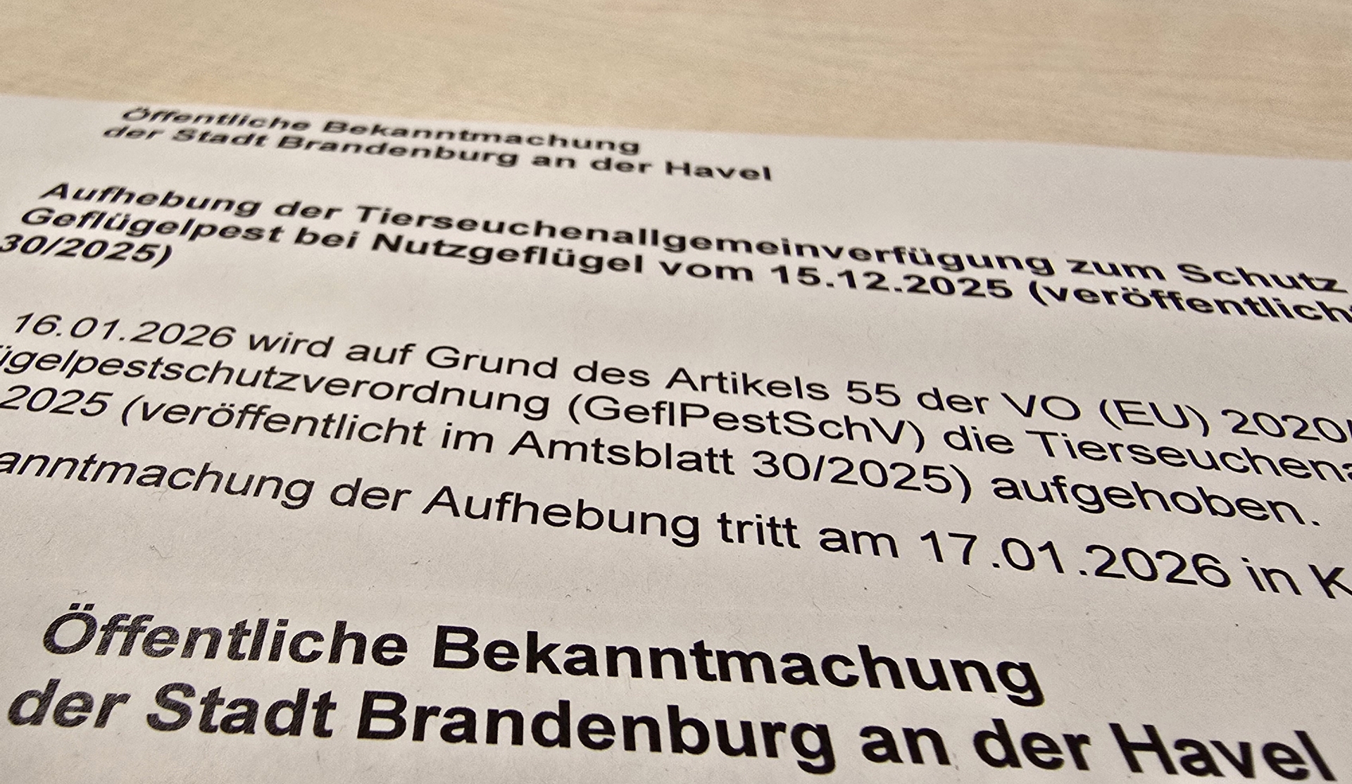 Am Freitag, dem 16. Januar 2026, wurde die Tierseuchen-Allgemeinverfügung vom 15. Dezember 2025 (veröffentlicht im Amtsblatt Nummer 30/2025) aufgehoben.