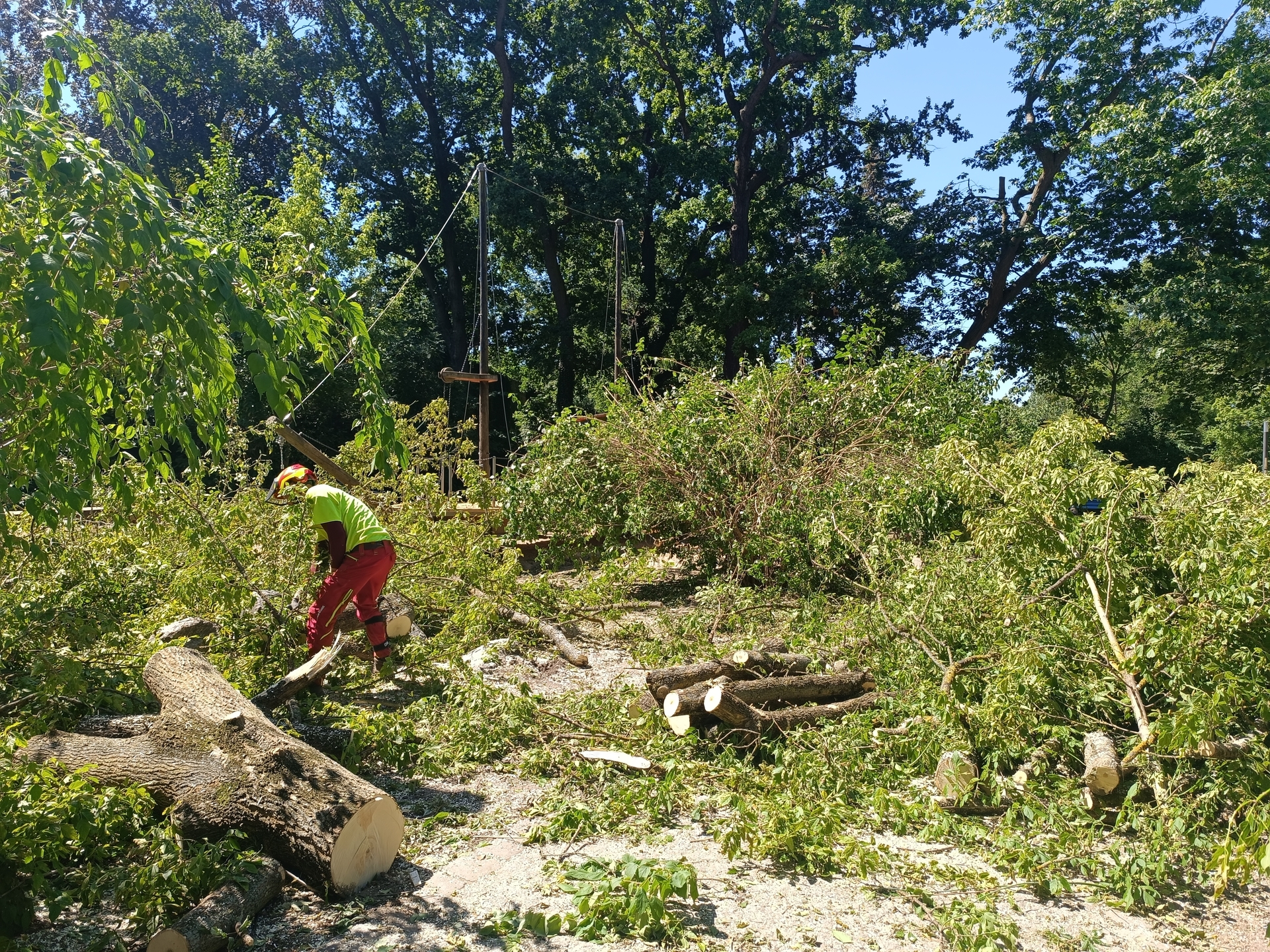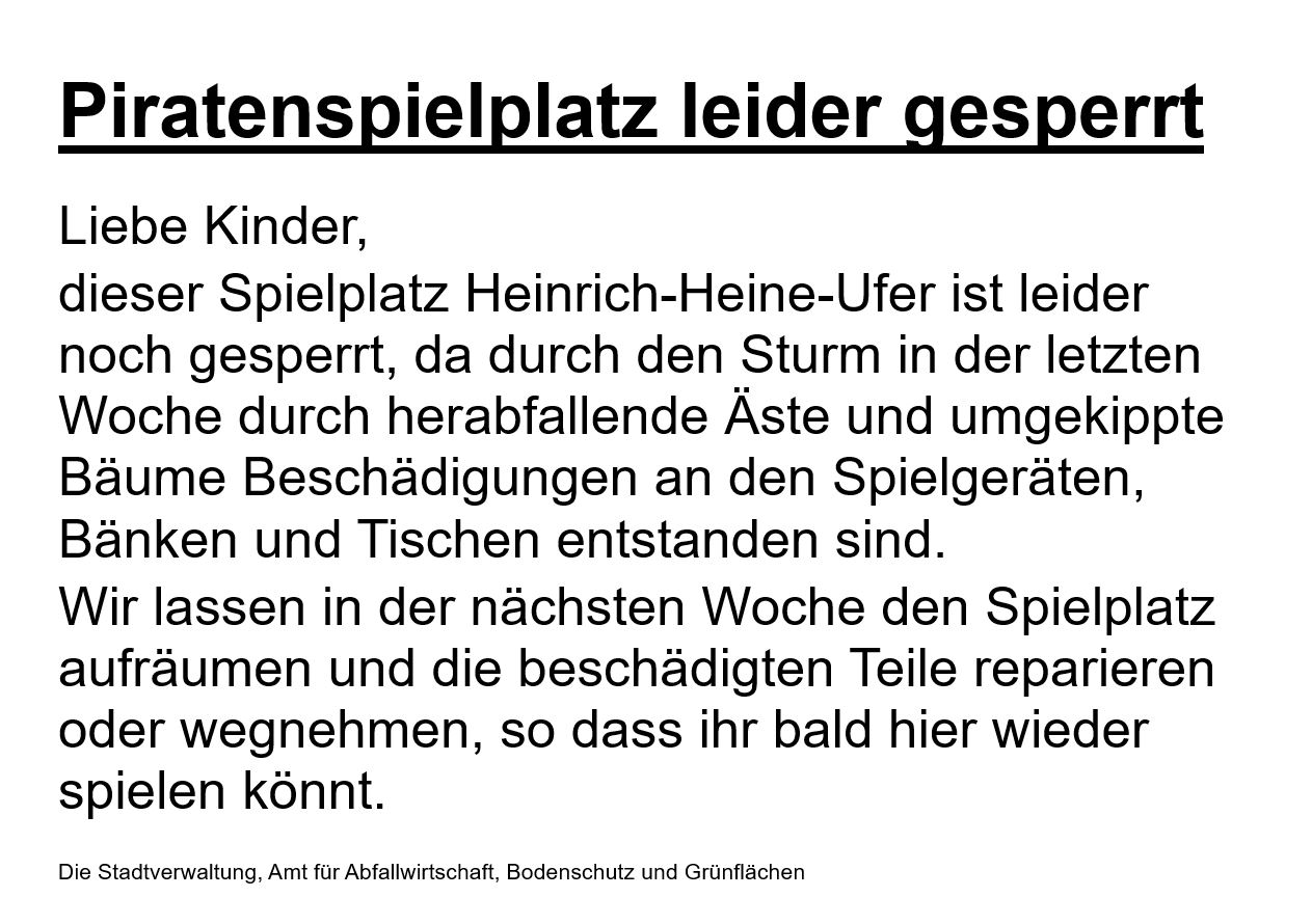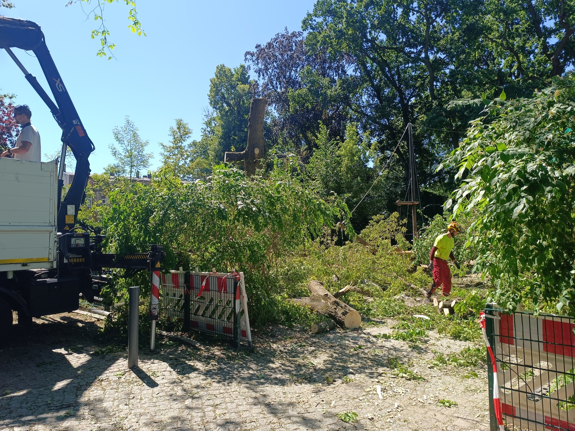 Seit dem Gewittersturm am 26. Juni 2025 wird auf dem gesperrten Schiff-Spielplatz am Heinrich-Heine-Ufer aufgeräumt. Dennoch wird er voraussichtlich erst in der kommenden Kalenderwoche (KW 28) wieder bespielbar sein, da aufgrund des Sturmes große Äste und Baumteile von umgestürzten Bäumen auf Spielgeräte, Bänke und Tische gefallen sind und teilweise Schäden verursacht haben.