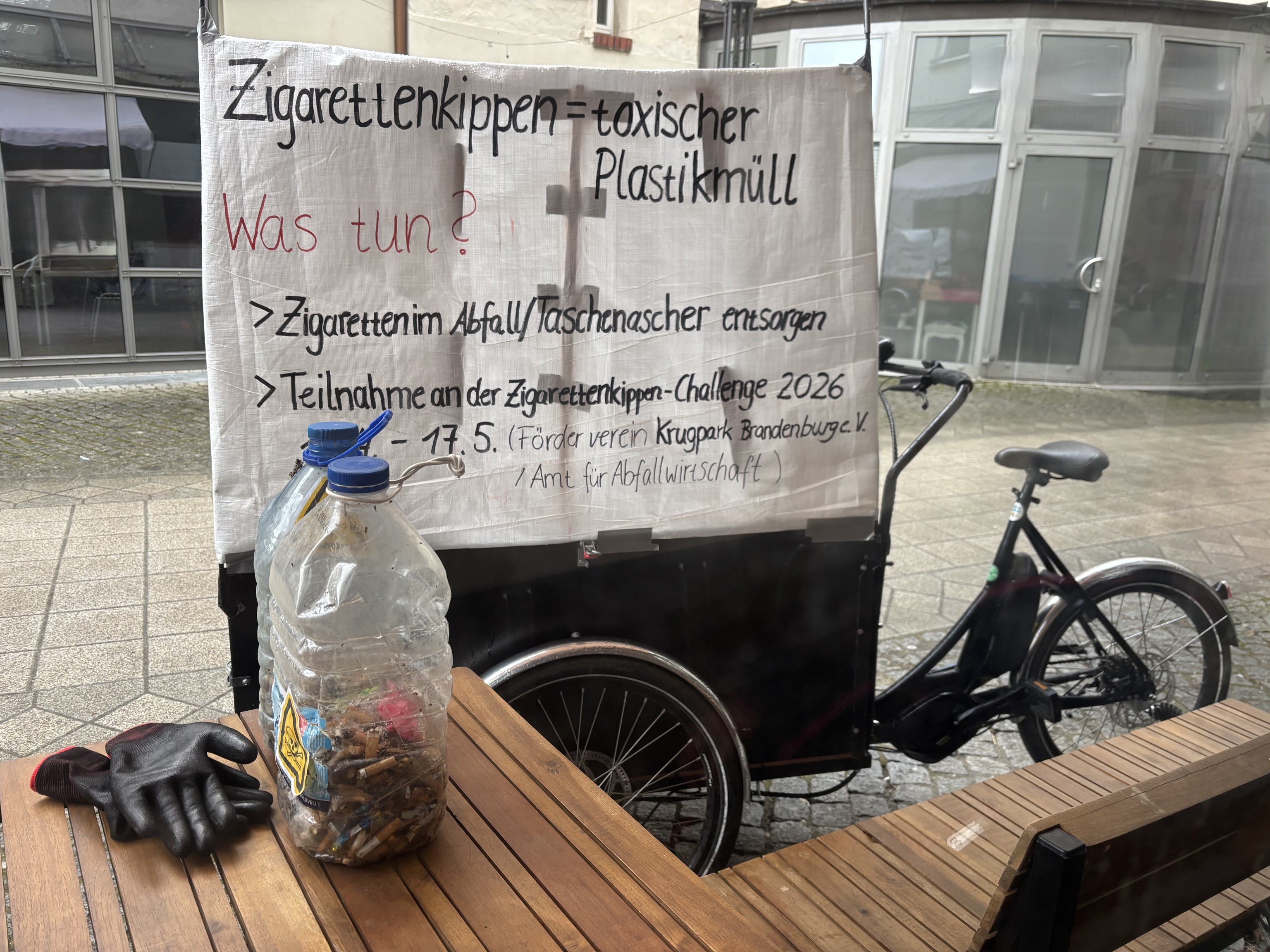 Das Amt für Abfallwirtschaft, Bodenschutz und Grünflächen der Stadt Brandenburg an der Havel und das Naturschutzzentrum Krugpark nimmt sich der Problematik an und ruft in diesem Jahr erneut Schulklassen zur Zigarettenkippen-Challenge auf. Diese soll die städtischen Oberschulen und Gymnasien in Form eines Wettbewerbs dazu motivieren, eine einstündige Sammelaktion durchzuführen, um dabei so viele Zigarettenkippen wie möglich aus der Umwelt zu entfernen.
