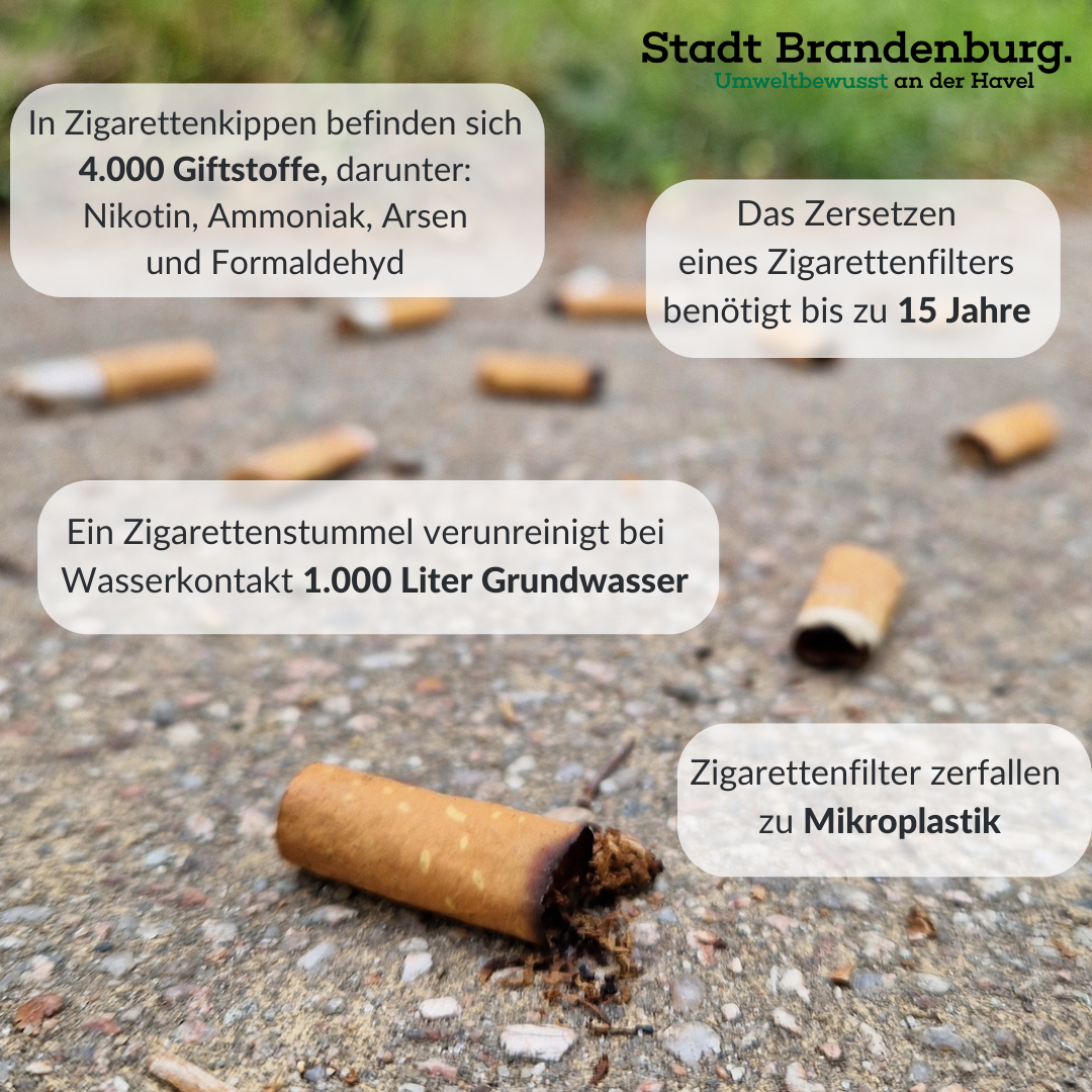 Bis zu 4.000 verschiedene Schadstoffe lassen sich in den Zigarettenstummeln nachweisen, worunter auch Stoffe aus krebserregenden Substanzen sind. Diese Stoffe werden durch das Regenwasser ausgewaschen und können somit auch ins Grundwasser gelangen. Der giftige Mix einer einzigen Zigarettenkippe reicht aus, um 1.000 Liter Grundwasser zu verunreinigen – oder das Pflanzenwachstum negativ zu beeinflussen.