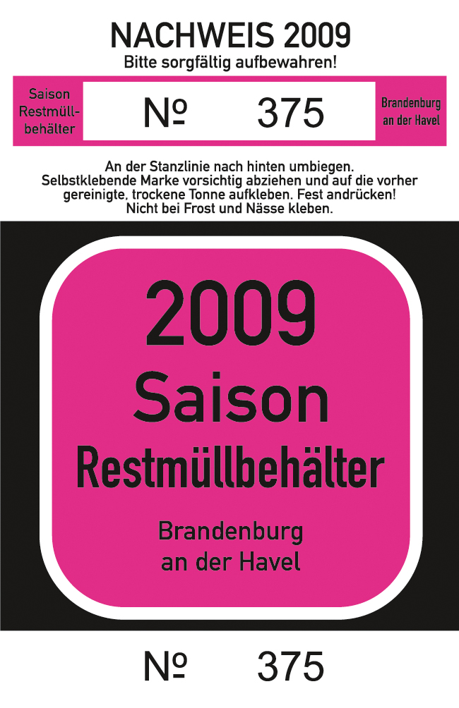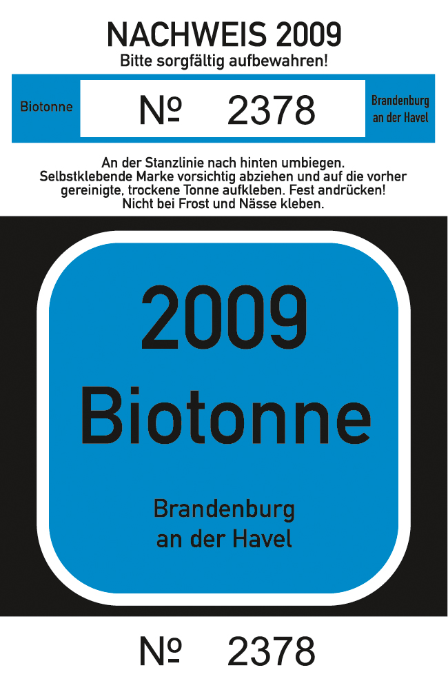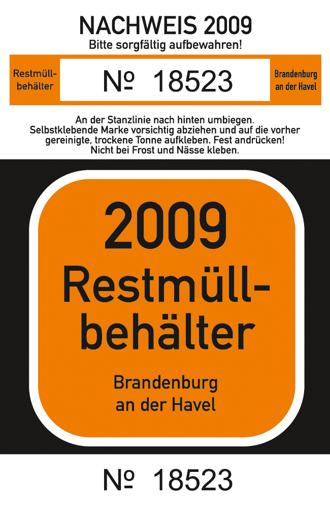 Ab sofort werden im Fachbereich Stadtentwicklung und Bauwesen (Fachgruppe Abfall- und Bodenschutz, Klosterstraße 14, Zimmer F 305 , Telefon (03381) 58 31 19 und 58 31 20) die Müllmarken für Restabfallbehälter und Biotonnen für das Jahr 2009 an Grundstückseigentümer oder deren Beauftragte ausgegeben. Die Ausgabe erfolgt während der üblichen Sprechzeiten.