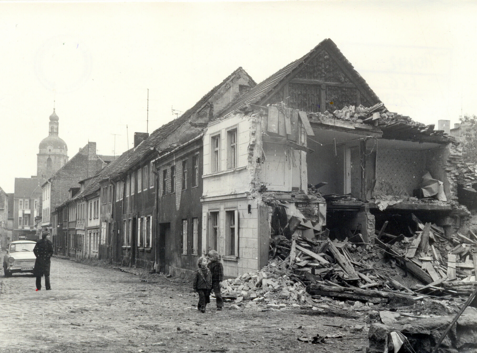 Die Ausstellung zeichnet die Planungen zum Umbau nach sozialistischem Muster aus den späten 1960er Jahren und den damit einhergehenden Abrissen in den Altstädten Ostdeutschlands auf. In Brandenburg an der Havel sollte zum Beispiel rund um die Jahrtausendbrücke ein vollkommen neues Stadtzentrum mit großen Magistralen entstehen. Wie hätte die historische „Chur- und Hauptstadt der Mark Brandenburg“ ausgesehen, wäre es nach der Überarbeitung des Generalbebauungsplans Mitte der 1980er Jahre zur vollständigen Umsetzung gekommen? Die Ausstellung thematisiert aber nicht nur die Vernachlässigung der historischen Stadtkerne, sondern auch den sich allmählich formierenden Widerstand dagegen von Bewohnern und Bürgergruppen. In Brandenburg an der Havel kam es mit der Auswahl zur Modellstadt für die Stadterneuerung nach 1990 für weite Teile der historischen Bausubstanz zu einem „happy ending“, auch wenn über viele Jahre schmerzhafte Verluste zu verzeichnen waren.