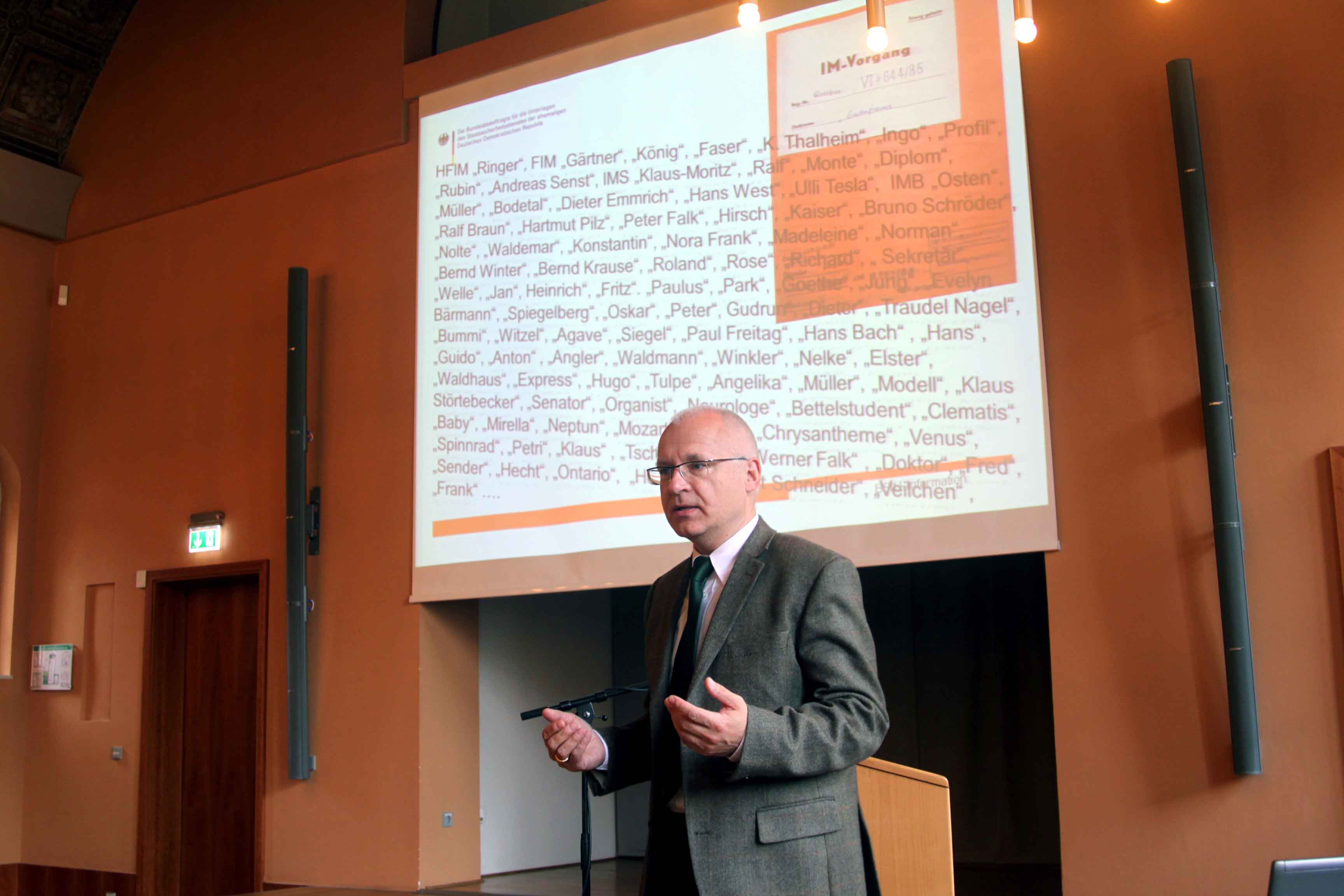 Um 17:00 Uhr begann die Vortrags- und Gesprächsrunde im Rolandsaal des Altstädtischen Rathauses, zu der Oberbürgermeisterin Dr. Dietlind Tiemann alle Anwesenden begrüßte. Der Außenstellenleiter der BStU, Rüdiger Sielaff, hielt einen Vortrag zum Wirken der Staatssicherheit in der Region. Ca. 70 Gäste folgten interessiert dem Vortrag.