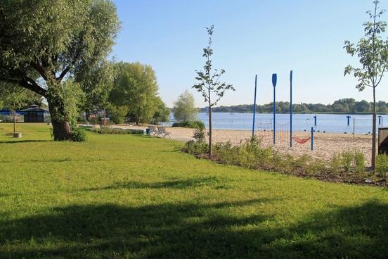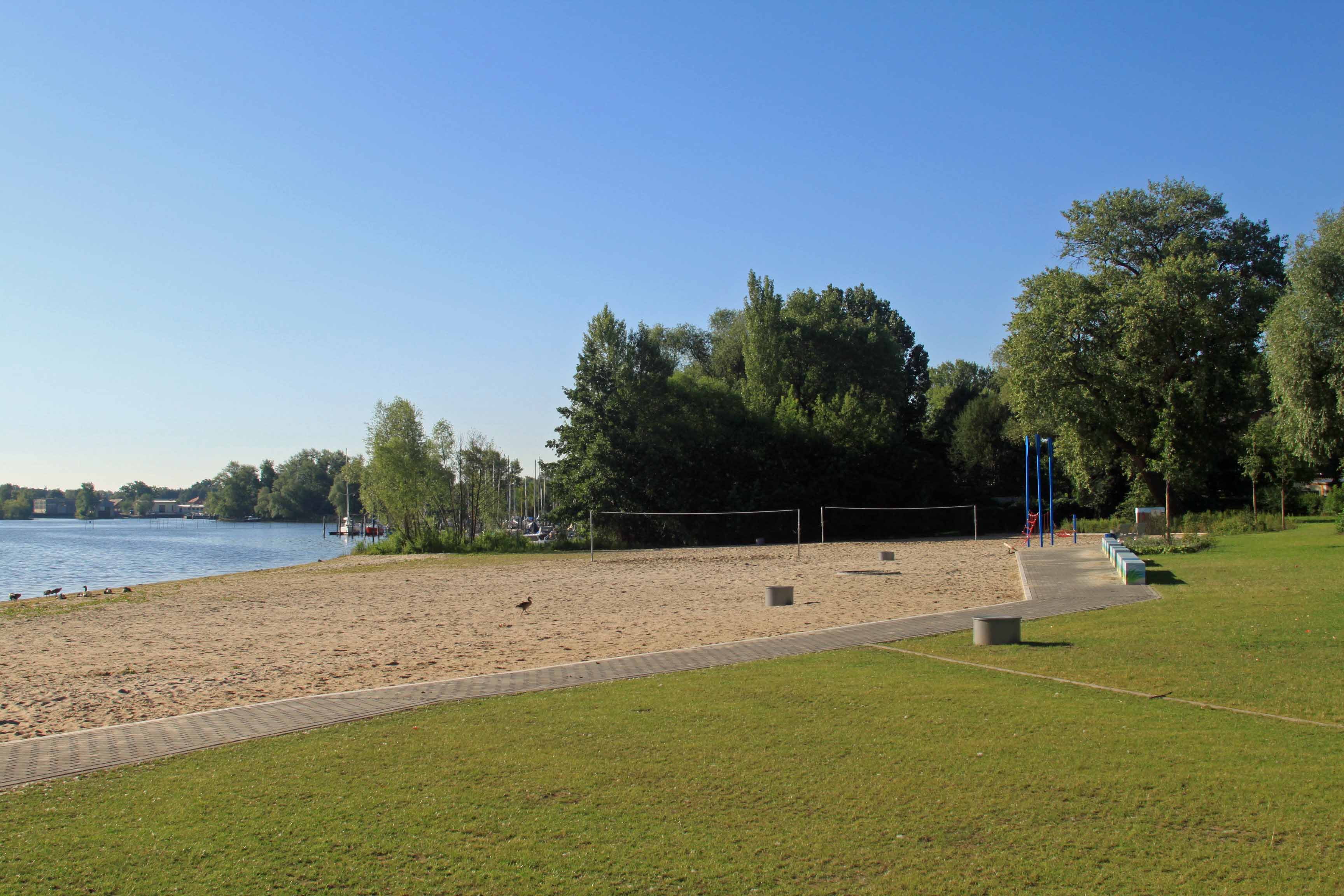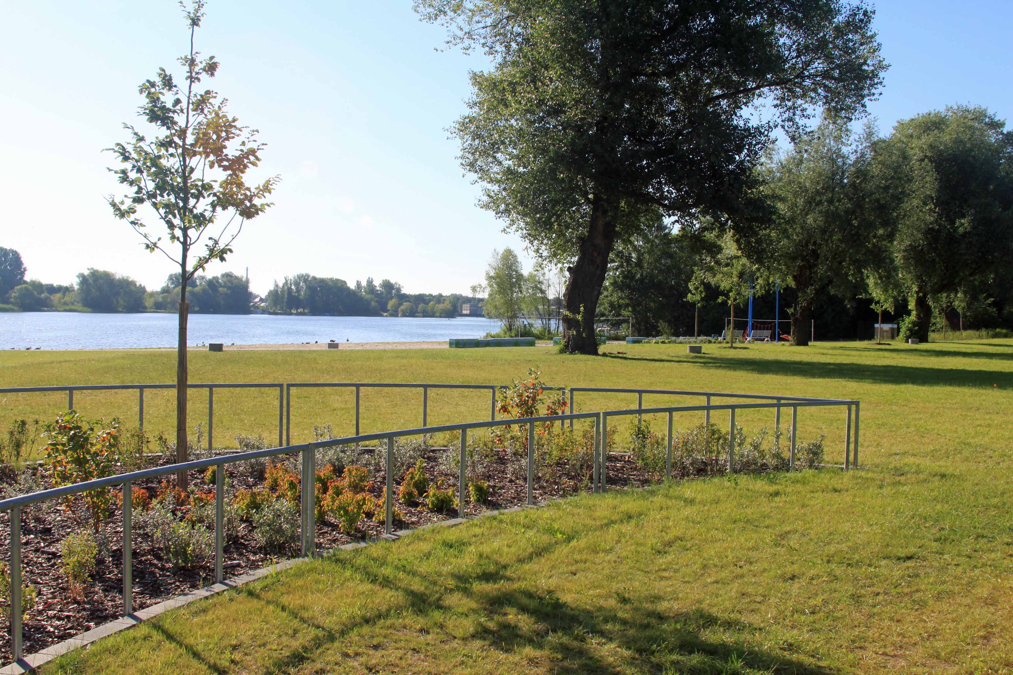 In dem Bauzeitraum vom 02.08.2010 – 01.07.2011 wurde die gesamte Fläche, 10.990 m² umgestaltet und aufgewertet. 7.400 m² Vegetationsfläche wurden angelegt. Der Sandstrand mit einer Fläche von 2.500 m² wurde bis zu einer Tiefe von 30 cm gereinigt. In Ufernähe wurden 2 Volleyballfelder und eine Spielgerätezone angelegt. Weiterhin bieten Sitz- und Liegemöglichkeiten Gelegenheit zur Entspannung. Die Gestaltung der Wandflächen erfolgte durch Graffiti. Darüber hinaus wurden Fahrradabstellplätze geschaffen.