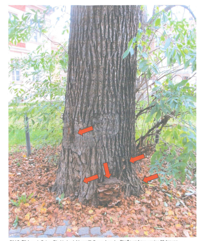 Der äußerlich vital erscheinende Baum weist schwere Schäden am Stammfuss auf. Desweiteren sind Pilzfruchtkörper sichtbar.