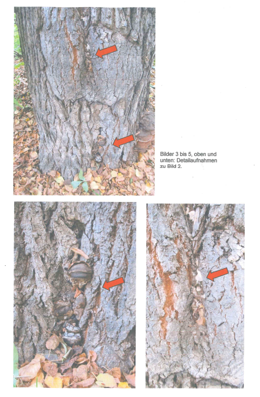 Durch ein Kurzgutachten sind Messungen durchgeführt worden. An mehreren Stellen ist die Stärke der Stammwand weit unter den kritischen Werten. Somit besteht eine Gefahr durch Stammbruch
