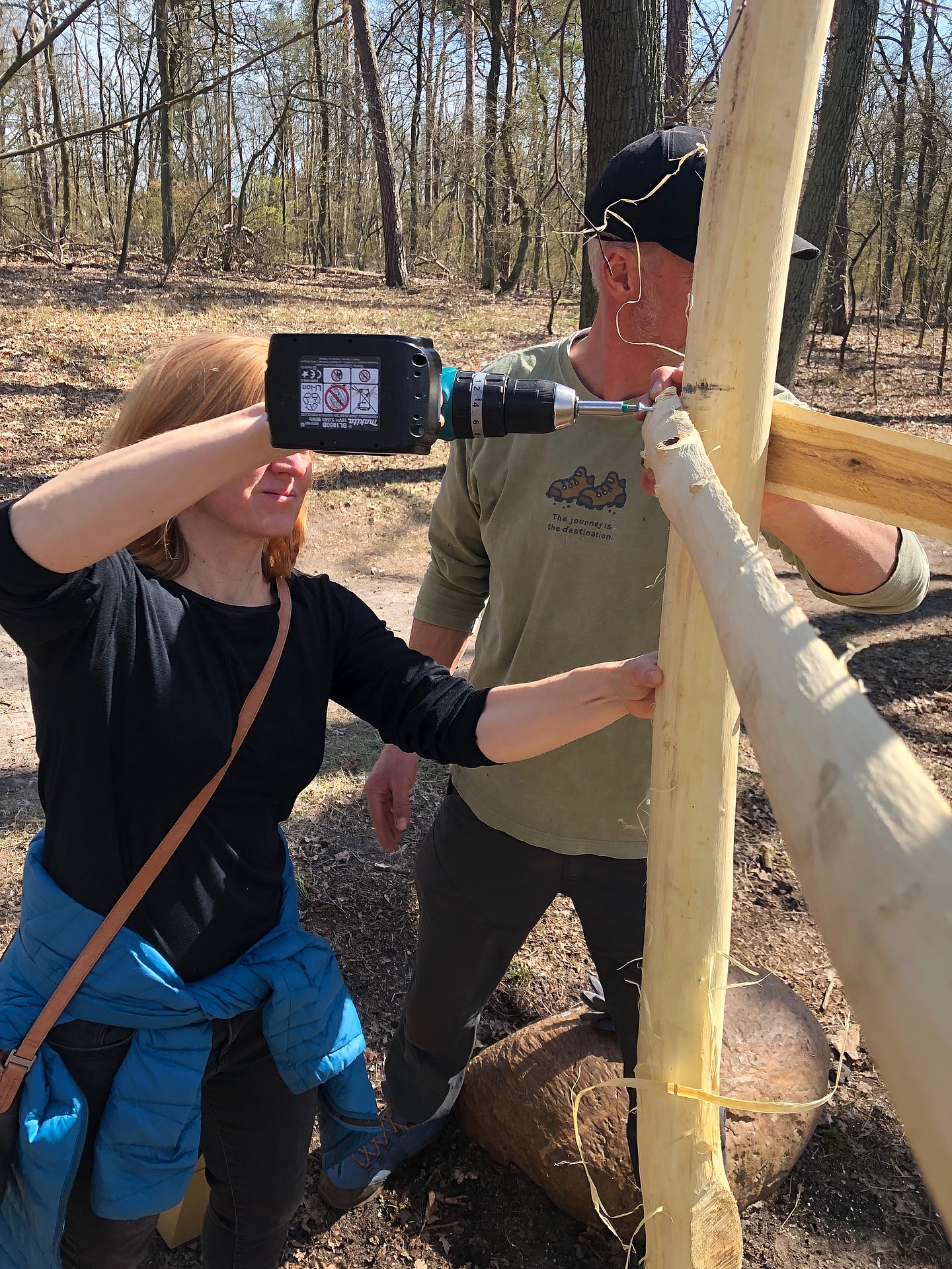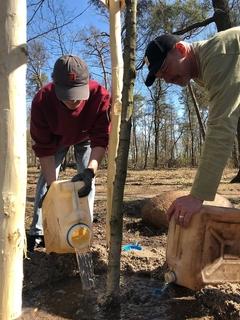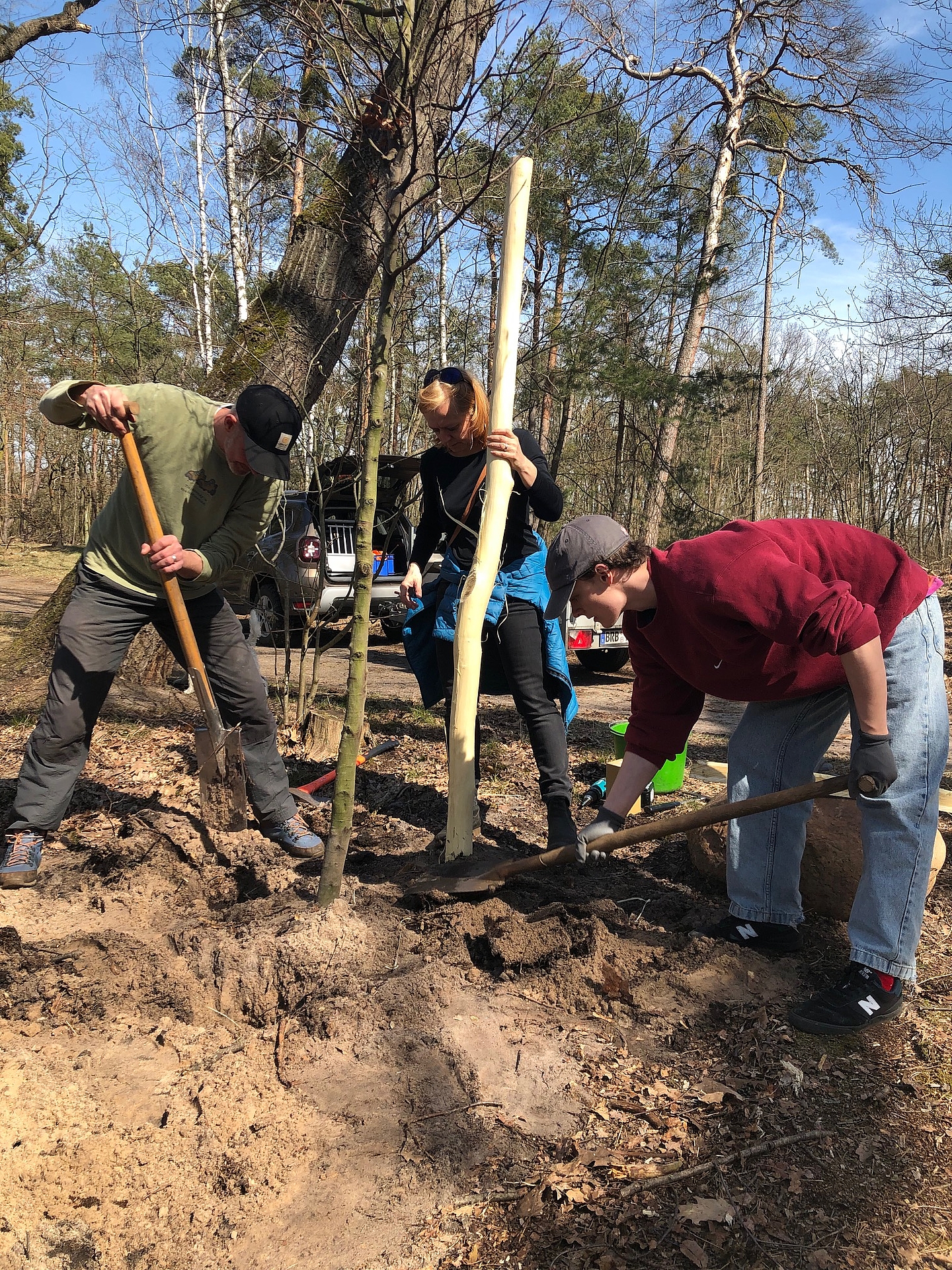 Bei strahlendem Sonnenschein wurde mit vollem Einsatz gegraben, geschraubt und gewässert. Nebenbei erzählte der Stadtförster etwas über die Buche, zum Beispiel dass sie Sonnenbrand bekommen kann. Nach gut einer Stunde war es geschafft und der Baum stand fest verankert, im Boden direkt am Wanderweg des Gördensees.