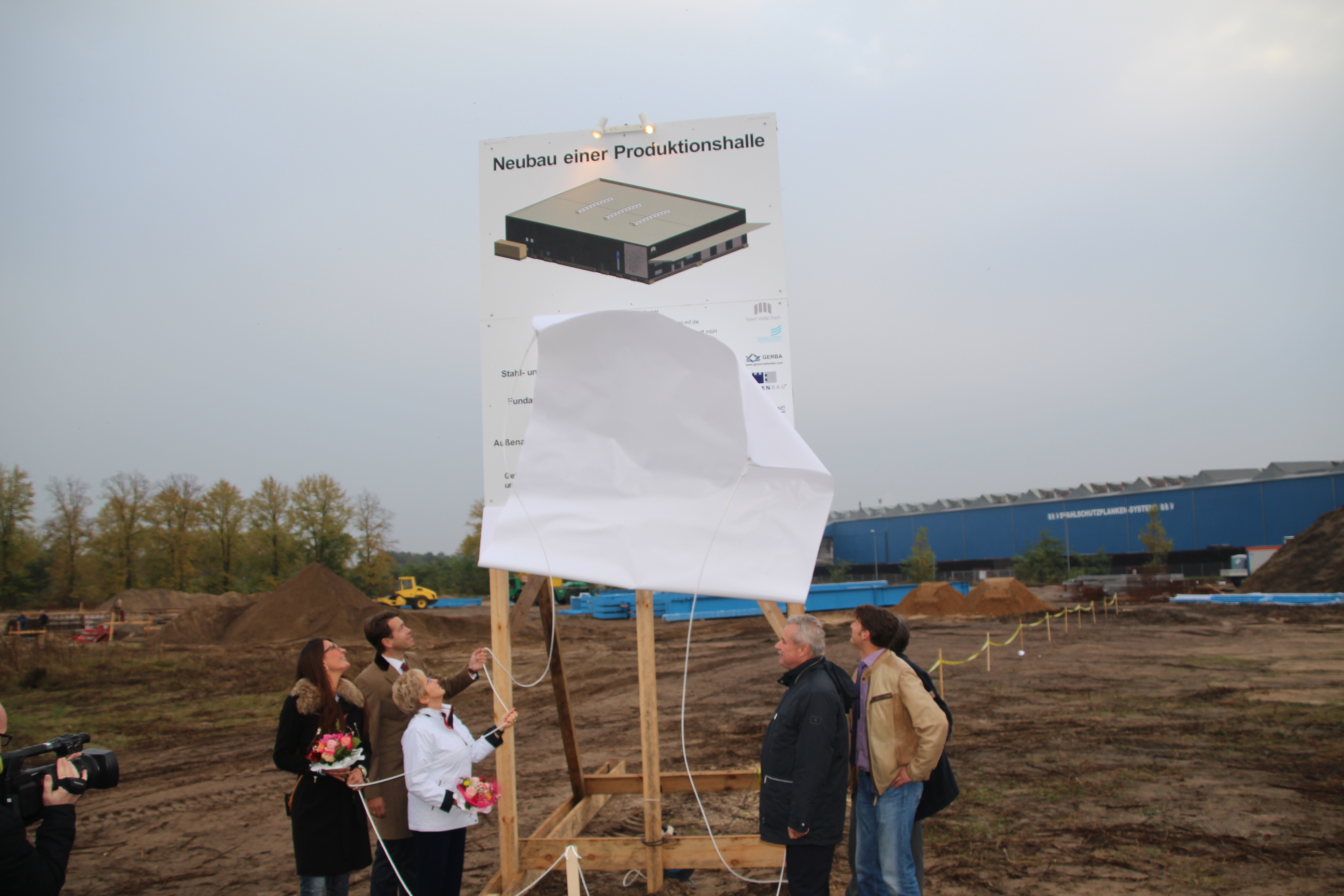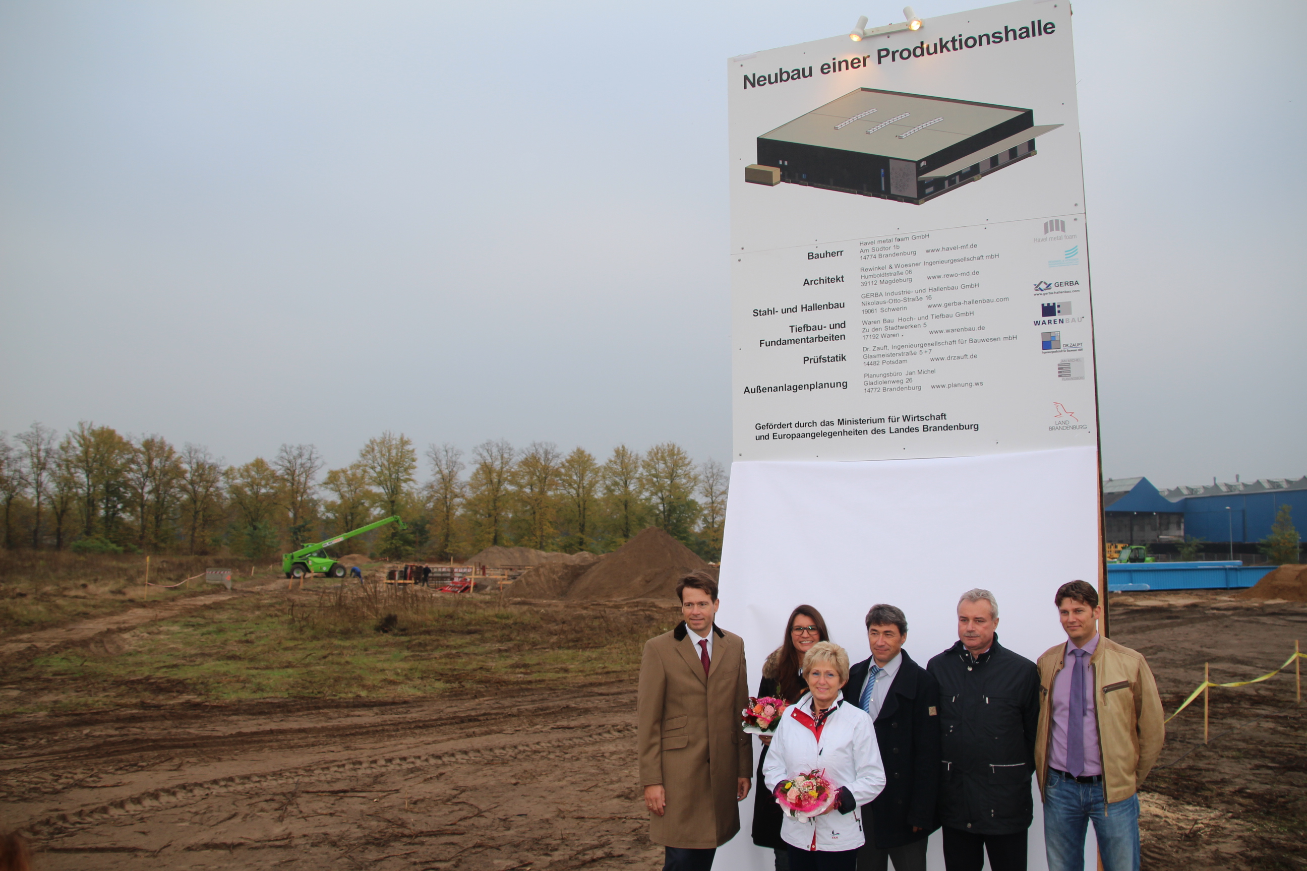Mit dem Start in die dritte Bauphase und dem Beginn des Hallenneubaus der Firma Havel metal foam GmbH in Kirchmöser enthüllten am Donnerstag, 16.10.2014, Geschäftsführer Dirk Zielke und Oberbürgermeisterin Dr. Dietlind Tiemann sowie Firmengesellschafter feierlich das Bauschild der zukünftigen Metallschaum Produktionsstätte.