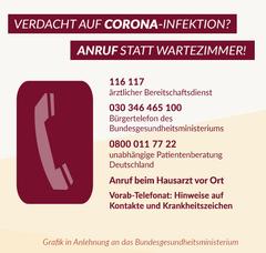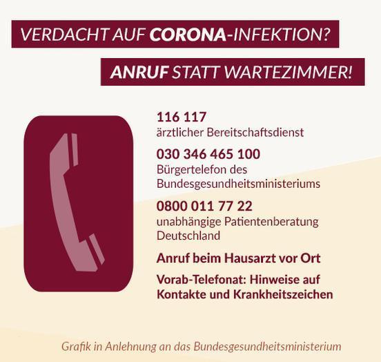 - (030) 346 465 100 – Bürgertelefon des Bundesgesundheitsministeriums - www.bundesgesundheitsministerium.de/coronavirus.html