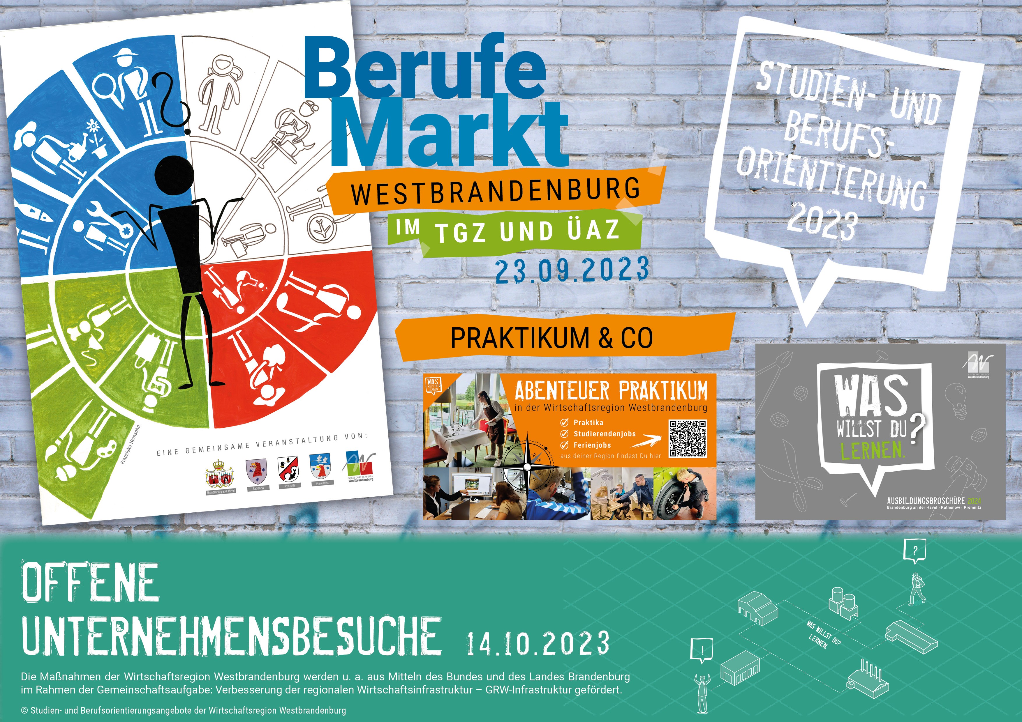 Mit dem 23. Berufemarkt Westbrandenburg am Samstag, 23. September 2023, können Jugendliche und Unternehmen erste Kontakte knüpfen und Näheres über Ausbildungs- und Studienangebote erfahren. Veranstaltungsorte sind das Technologie- und Gründerzentrum sowie das Überbetriebliche Ausbildungszentrum in der Stadt Brandenburg an der Havel. Drei Wochen danach, am 14. Oktober 2023, sollen angemeldete Interessierte wieder die Möglichkeit erhalten, Unternehmen vor Ort zu besichtigen. Ziel der „Offenen Unternehmensbesuche 2023“ ist es, Unternehmen kennenzulernen und typische Tätigkeiten auszuprobieren, um den Teilnehmenden die zukünftige Berufsauswahl zu erleichtern.