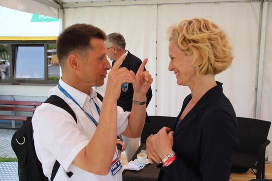 Die Brandenburger Regattastrecke gilt unter Fachleuten auch als hervorragendes Beispiel einer gelungenen Kombination von bestehender Bausubstanz und modernen Erweiterungsbauten. Vor dem Hintergrund notwendiger Sanierungs- und Modernisierungsmaßnahmen, die im Vorfeld der auf der Regattastrecke Strathclyde bei Glasgow geplanten Ruder-EM 2018 erforderlich sind, wurde der Britische Ruderverband vom Weltverband FISA auf den neuen Zielturm am Beetzsee in Brandenburg an der Havel aufmerksam gemacht. „Als wir davon bei der diesjährigen EM erfuhren, waren wir natürlich freudig überrascht, dass unser im Jahr 2011 fertiggestellter neuer Turm und dessen funktional wie optisch gut gelungene Anbindung an den bestehenden Turm von 1969 anderen Nationalverbänden als positives Beispiel genannt wird“ sagt Regattastrecken-Chef Uwe Philipp und fährt fort: „Noch während der EM in Poznan haben wir Annamarie Phelps, Präsidentin des Britischen Ruderverbandes, versprochen, Kontakt zu unseren Planern herzustellen und unseren Ruderfreunden aus England einen Besichtigungstermin hier bei uns vor Ort angeboten. Inzwischen sind bereits mehrere Mails hin und her gegangen und ich denke, dass es zum Ende der Saison ein Treffen zwischen den Fachleuten geben wird.“
