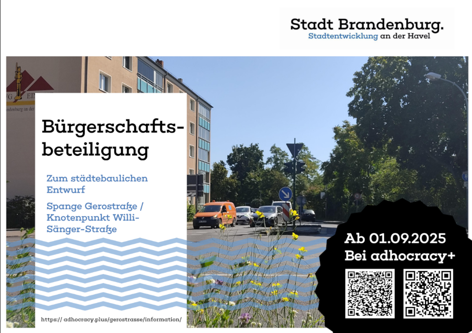 Ab 1. September 2025 gibt es für alle Bürgerinnen und Bürger der Stadt Brandenburg an der Havel die Möglichkeit, sich über den aktuellen Stand der Planung zur Spange Gerostraße zu informieren. Außerdem kann der städtebauliche Entwurf der Gerostraße direkt über die Beteiligungsplattform Adhocracy Plus kommentiert werden. Die Bürgerschaft wird gebeten, Hinweise und Vorschläge zur Gestaltung des Rahmenplans an die Stadtentwicklung zu übermitteln.