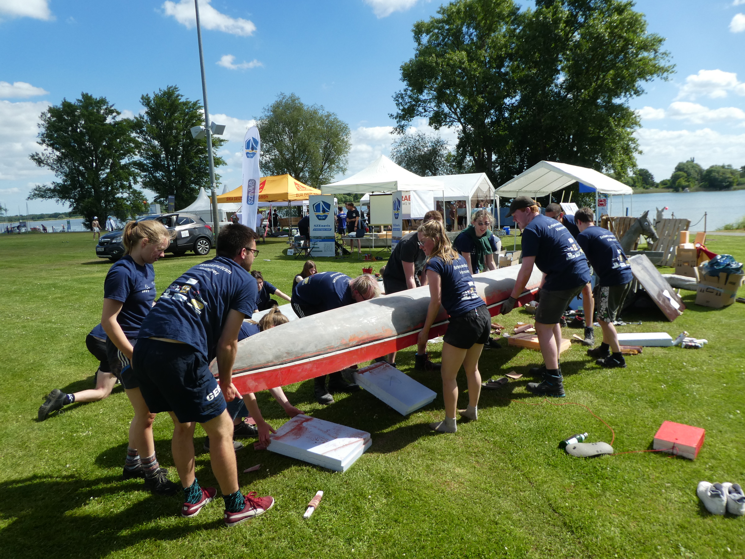 Studententeams aus Deutschland und mehreren anderen Ländern bereiten ihre außergewöhnlichen Wasserfahrzeuge für die 18. Deutsche Betonkanu-Regatta vor.