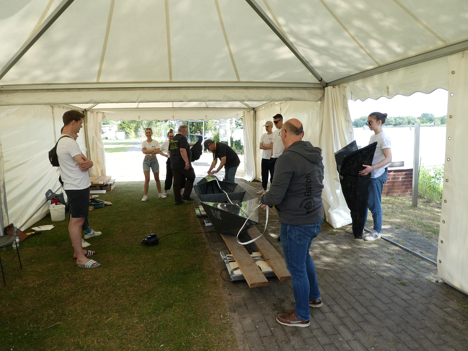 Die meisten Teams, die am 11.06.2022 an der 18. Deutschen Betonkanu-Regatta auf dem Brandenburger Beetzsee teilnehmen, sind inzwischen in der Havelstadt angekommen und haben ihre Zelte auf dem Gelände der Regattastrecke aufgeschlagen. Dort und auf dem sogenannten Sattelplatz, wo die von den Studierenden selbst gebauten Kanus und anderen Wasserfahrzeuge aus Beton für denn Wettkampf vorbereitet werden, herrscht reges Treiben. Zwischen den Stationen der einzelnen Hochschulen und Universitäten sind Jury-Mitglieder des InformationsZentrums Beton unterwegs, die die Eigenkonstruktionen begutachten und in einem speziellen Waagezelt vermessen und wiegen. Bei bestem Sommerwetter genießen die Teams auf lockere Art und Weise die Zeit am Ufer des Beetzsees oder trainieren für den Wettbewerb am nächsten Tag.