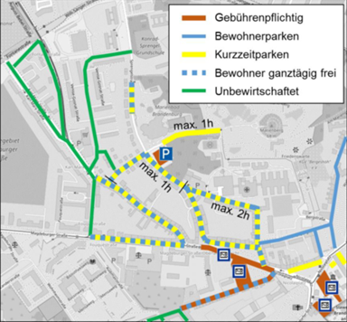 Am 28.11.2018 hat die Stadtverordnetenversammlung der Stadt Brandenburg an der Havel ein neues Parkraumkonzept beschlossen. Dieses sieht unter anderem die Erweiterung der bereits bestehenden Bewohnerparkzone E auf die Harlungerstraße sowie der stadteinwärtigen Seite der Magdeburger Straße zwischen Fouqué- und Harlungerstraße vor. In diesen Straßen wird es zukünftig werktags nur noch Kurzzeitparkplätze für maximal 2 Stunden geben, die von den Bewohnern des Bereiches ganztägig genutzt werden können.