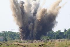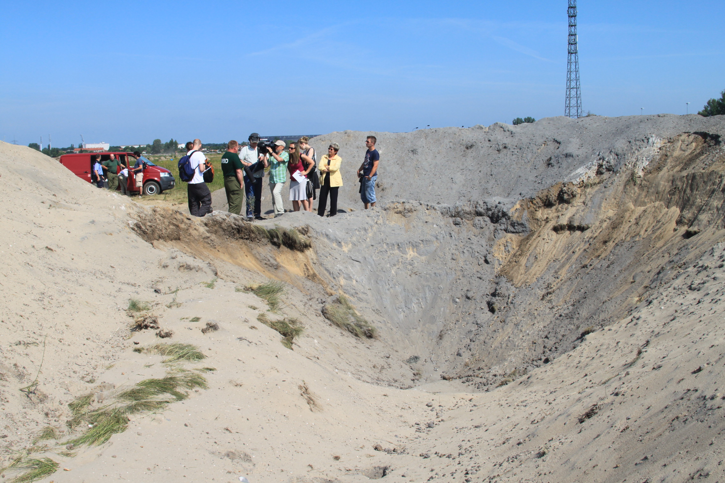 Der Luftraum über dem Gelände musste zwischen 09:45 Uhr und 10:15 Uhr gesperrt werden. Nach einer kurzen Verzögerung, der Sprengmeister Herr Kunzendorf musste noch einmal zur Bombe, um die Zündbrücke zu wechseln, gab es um 10:08 Uhr einen dumpfen Knall und eine große Sandfontäne schoss in den Himmel. Kurze Zeit später gab der Sprengmeister Entwarnung und bestätigte die erfolgreiche Sprengung der Bombe. Der Verwaltungsstab und die Presse hatten nun die Gelegenheit sich ein Bild vom Bombenkrater zu machen.
