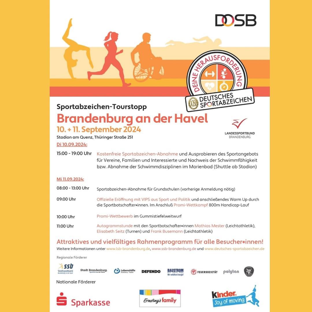Für das Deutsche Sportabzeichen können vor Ort Disziplinen wie Ausdauerlauf, Sprint, Medizinballweitwurf, Kugelstoßen, Schlagballweitwurf, Weitsprung, Zonenweitsprung, Standweitsprung, Liegestütze und Seilspringen absolviert werden. Ein Schwimmnachweis ist für den Erwerb des Sportabzeichens erforderlich. Teilnehmenden, die diesen Nachweis noch nicht haben, steht ein Shuttle-Service zum Marienbad zur Verfügung, wo die Schwimmfähigkeit getestet werden kann.