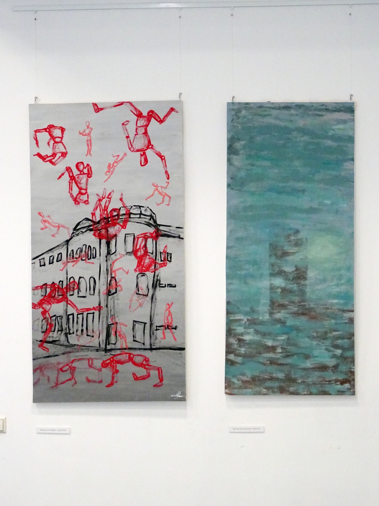 Nun werden einige Arbeiten, die in Kooperation mit der Wredow-Kunstschule entstanden sind, in zwei Führungen von den jungen Künstlerinnen und Künstlern selber vorgestellt. Sie erklären, wie sie das Thema ihres eigenen Bildes gefunden haben und wie der Weg von der Idee über Skizzen und Vorstudien bis zum fertigen Kunstwerk verlaufen ist. Kuratorin und Kursleiterin Franka Schwarz erläutert das Gesamtkonzept und geht auf spezifische Besonderheiten aller Bilder ein.