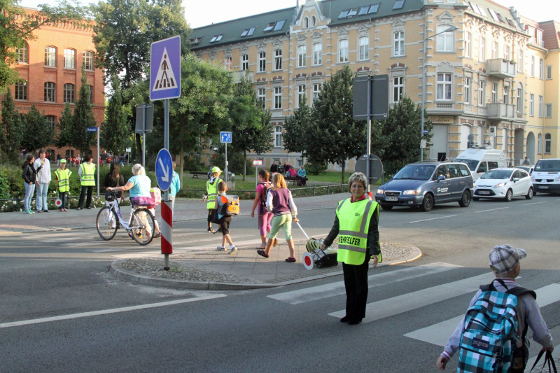 Mit einer Kelle in der Hand und mit neongelber Weste sorgten Oberbürgermeisterin Dr. Dietlind Tiemann und vier Schülerlotsen für einen sicheren Schulweg vor der Theodor-Fontane-Schule in Brandenburg an der Havel.