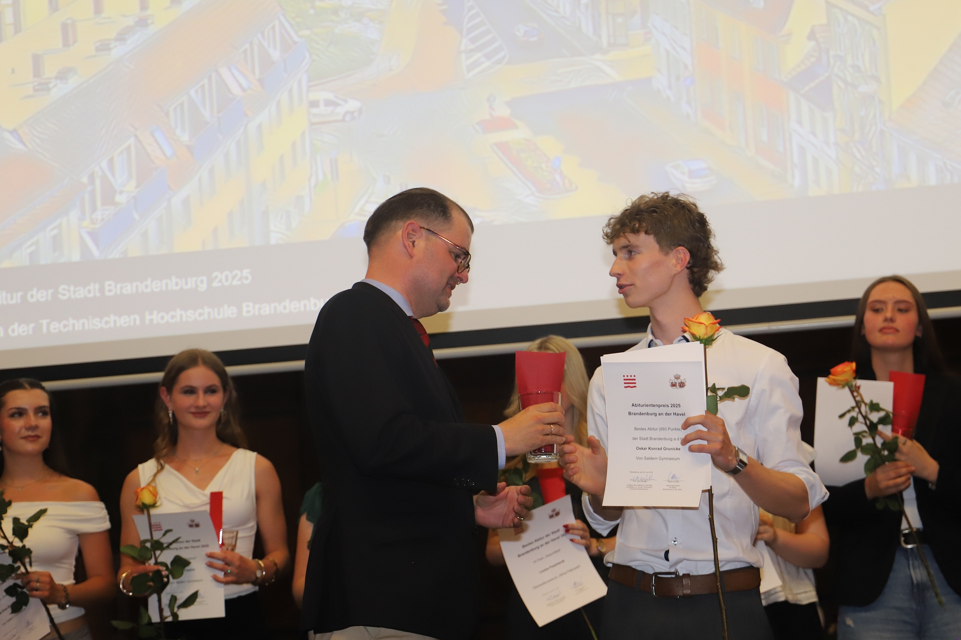 An der Technischen Hochschule Brandenburg (THB) wurden am Donnerstag die besten Abiturleistungen der Stadt Brandenburg an der Havel bei einem Sektempfang ausgezeichnet. Oskar Konrad Grunicke vom von Saldern-Gymnasium hat mit insgesamt 893 von 900 möglichen Punkten das beste Abiturzeugnis der Stadt Brandenburg an der Havel erhalten. Dafür wurde er gemeinsam mit anderen Schulabsolventinnen und -absolventen im Audimax der Technischen Hochschule Brandenburg ausgezeichnet.