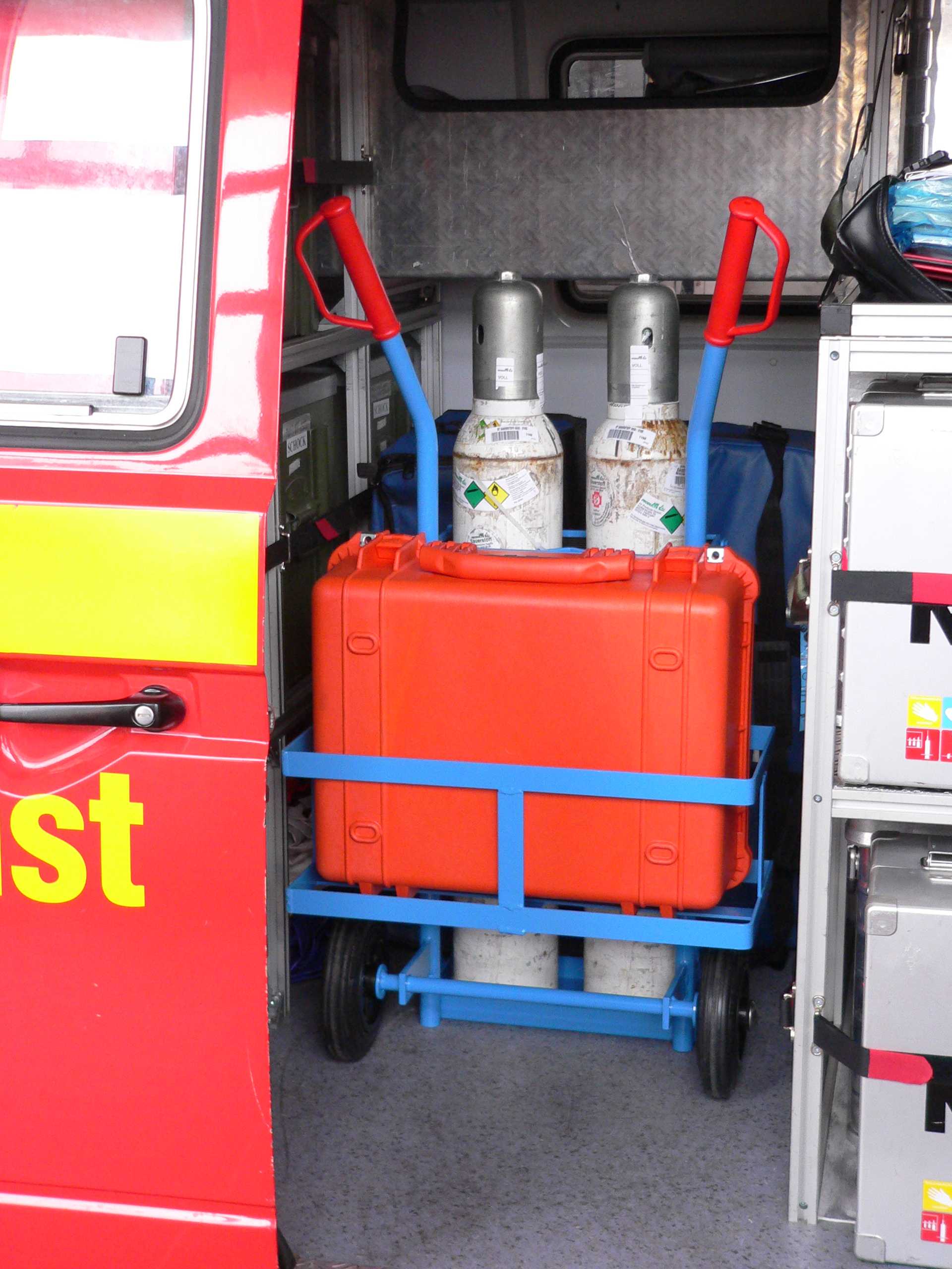 Die mobilen Sauerstoffversorgungssysteme ergänzen die Ausrüstung auf dem Gerätewagen Rettungsdienst (GW-RD). Dieses ehemalige Feuerwehreinsatzfahrzeug wurde im Jahr 2000 umgerüstet und unter anderem mit Regalsystemen versehen, um bei Schadensereignissen mit einer Vielzahl von Verletzten medizinisches Materialien für die Versorgung von bis zu 50 Patienten (med. Materialreserve) an den Einsatzort zu bringen. Neben der med. Materialreserve befinden sich auch zusätzliche Tragen, Funkgeräte und weitere Ausrüstungsgegenstände auf dem Fahrzeug. Ab dem 02.03.2009 transportiert das GW-RD nun auch die durch das Land geförderten Sauerstoffversorgungssysteme für die zentrale Versorgung von bis zu acht Patienten mit medizinischem Sauerstoff.