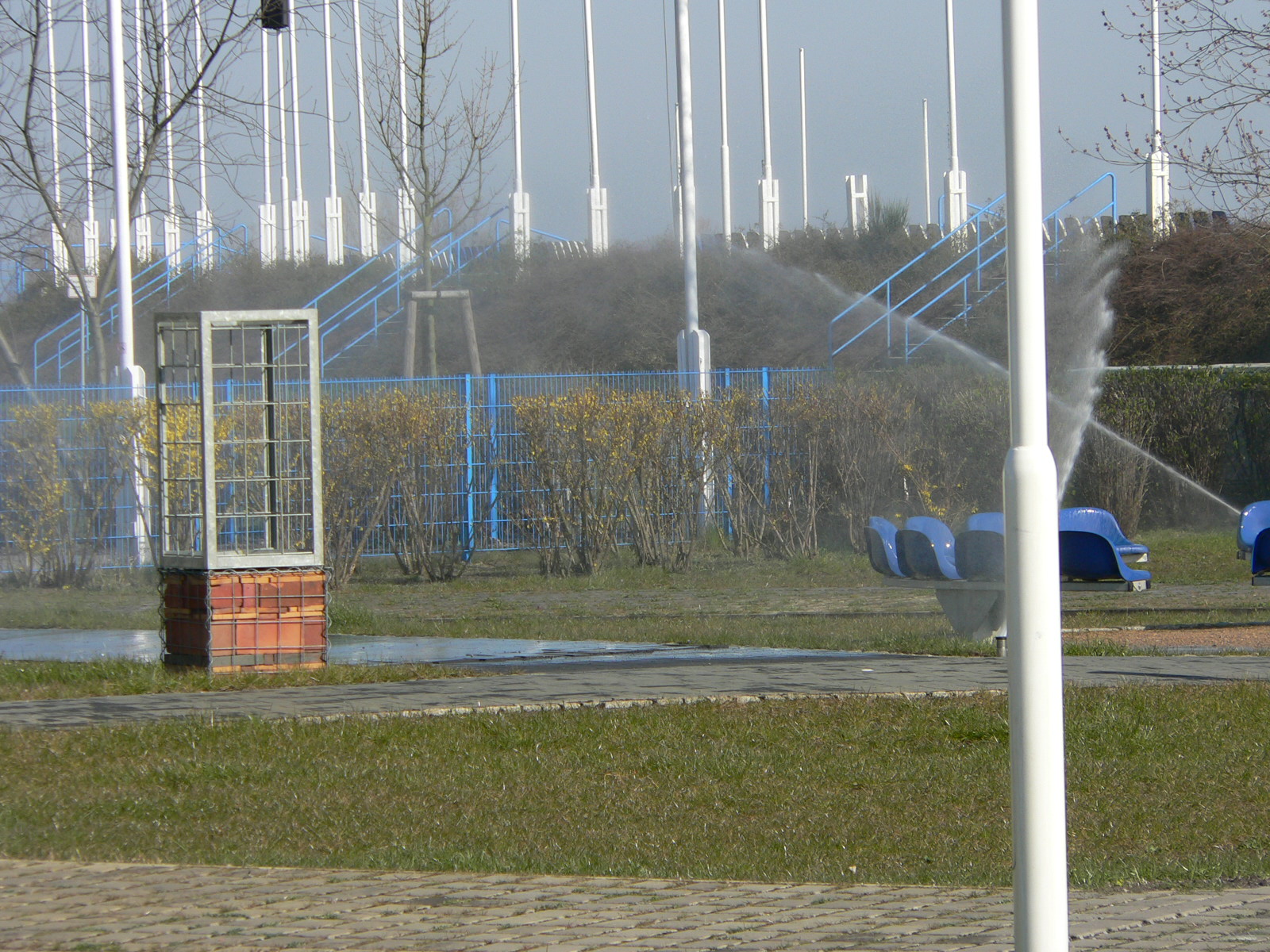 Nach dem Pressegespräch nahm Oberbürgermeisterin Dr. Dietlind Tiemann gemeinsam mit den Vertretern der Verbände und Vereine den ersten Teil der neuen Beregnungsanlage in Betrieb, in dem sie mit der Betätigung eines roten Druckknopfes die im Erdboden versenkten Sprenger in Gang setzte.