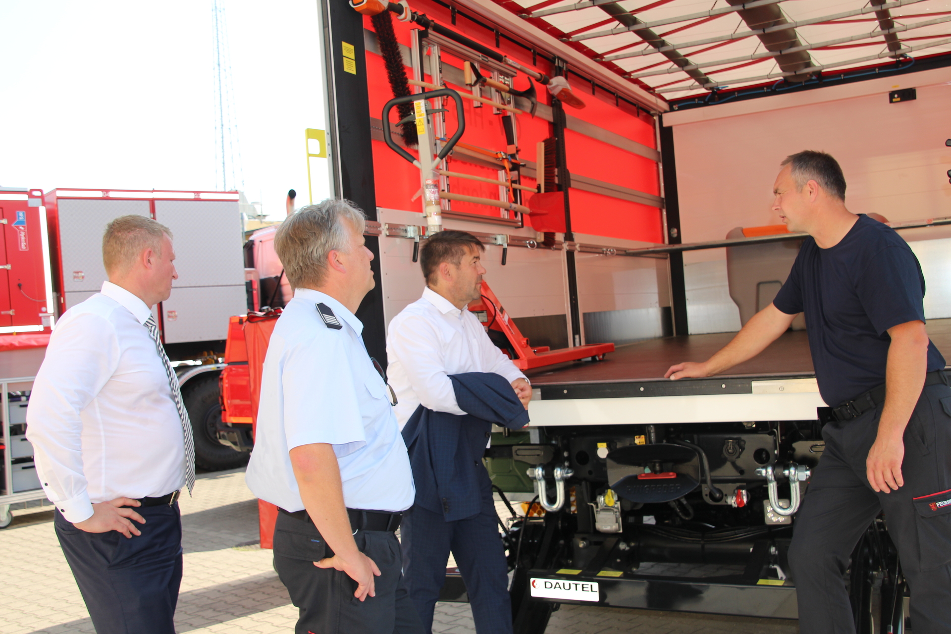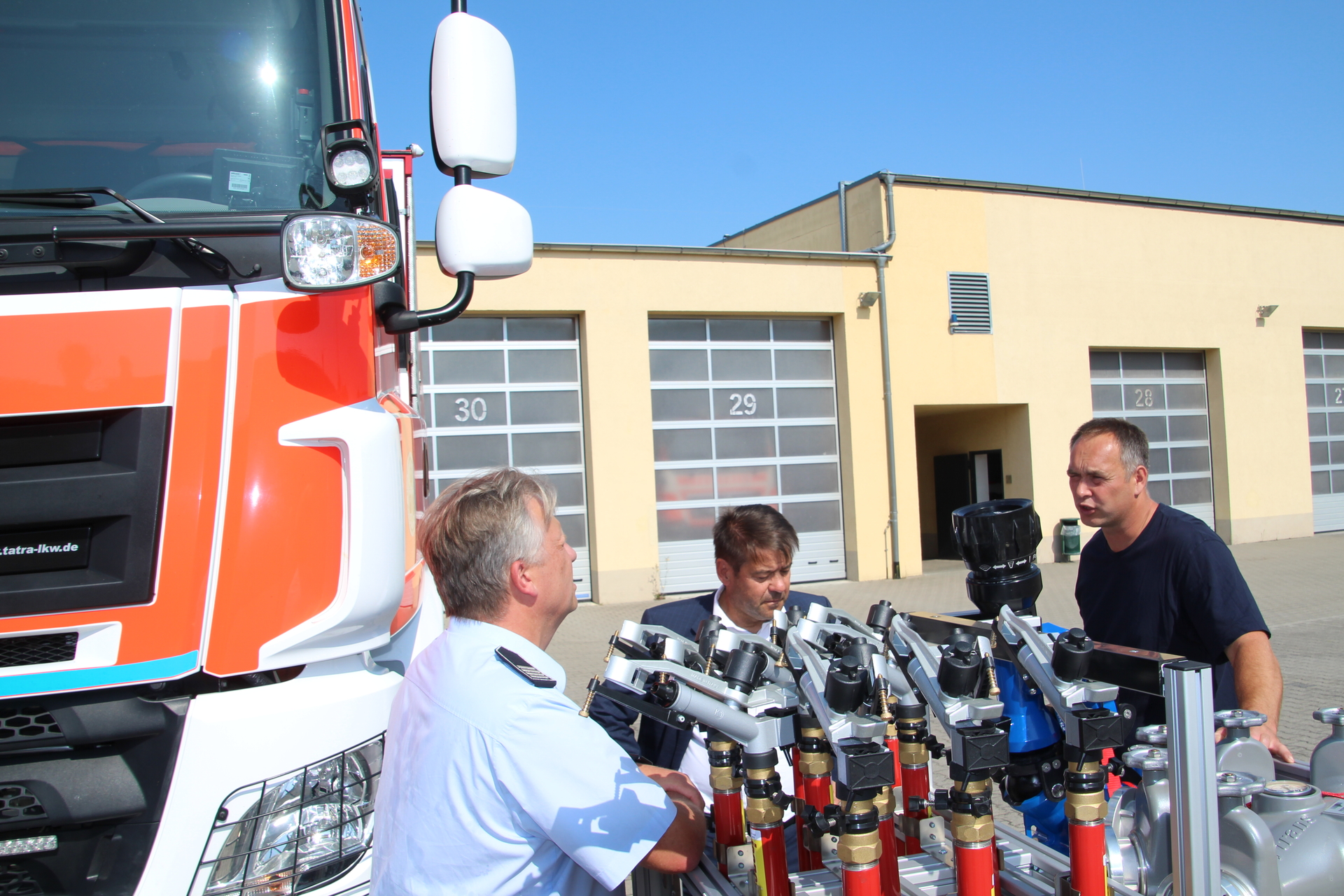 Oberbürgermeister Steffen Scheller und der Beigeordnete Thomas Barz haben heute den neuen Wasserförderzug (HFS) an die Feuerwehr übergeben, der landesweit und bei Großschadenslagen auch bundesweit eingesetzt werden kann. Die Fahrzeuge wurden vom Land gefördert. Brandamtmann Jan Lehnhardt, Leiter der Technik bei der Berufsfeuerwehr, erklärte den Gästen den Aufbau der Fahrzeuge.