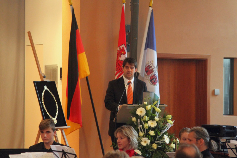 Nach der Begrüßung durch Bürgermeister Steffen Scheller und dem von Staatsekretär Zeeb überbrachten Grußwort der Landesregierung würdigte Dr. Liselotte Martius, Vorsitzende der Stadtverordnetenversammlung von Brandenburg an der Havel, das erfolgreiche Wirken von Dr. Dietlind Tiemann, die im Dezember 2003 das Amt des Stadtoberhauptes zum ersten Mal übernommen hatte. Nach der Vereidigung legte sie der alten und neuen Oberbürgermeisterin die Amtskette um.