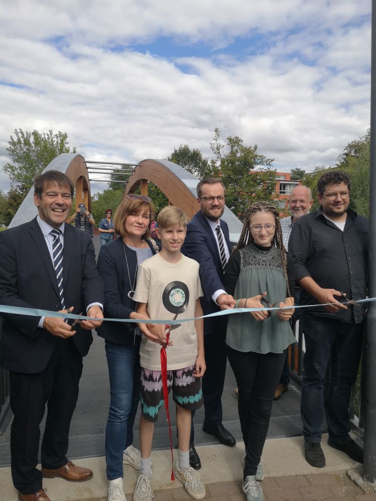 Anlässlich der Wiedereröffnung der reparierten Brücke über die Näthewinde lud Oberbürgermeister Steffen Scheller am Donnerstag, 1. September 2022, an die Verbindung zwischen Hammerstraße und Dominsel ein.