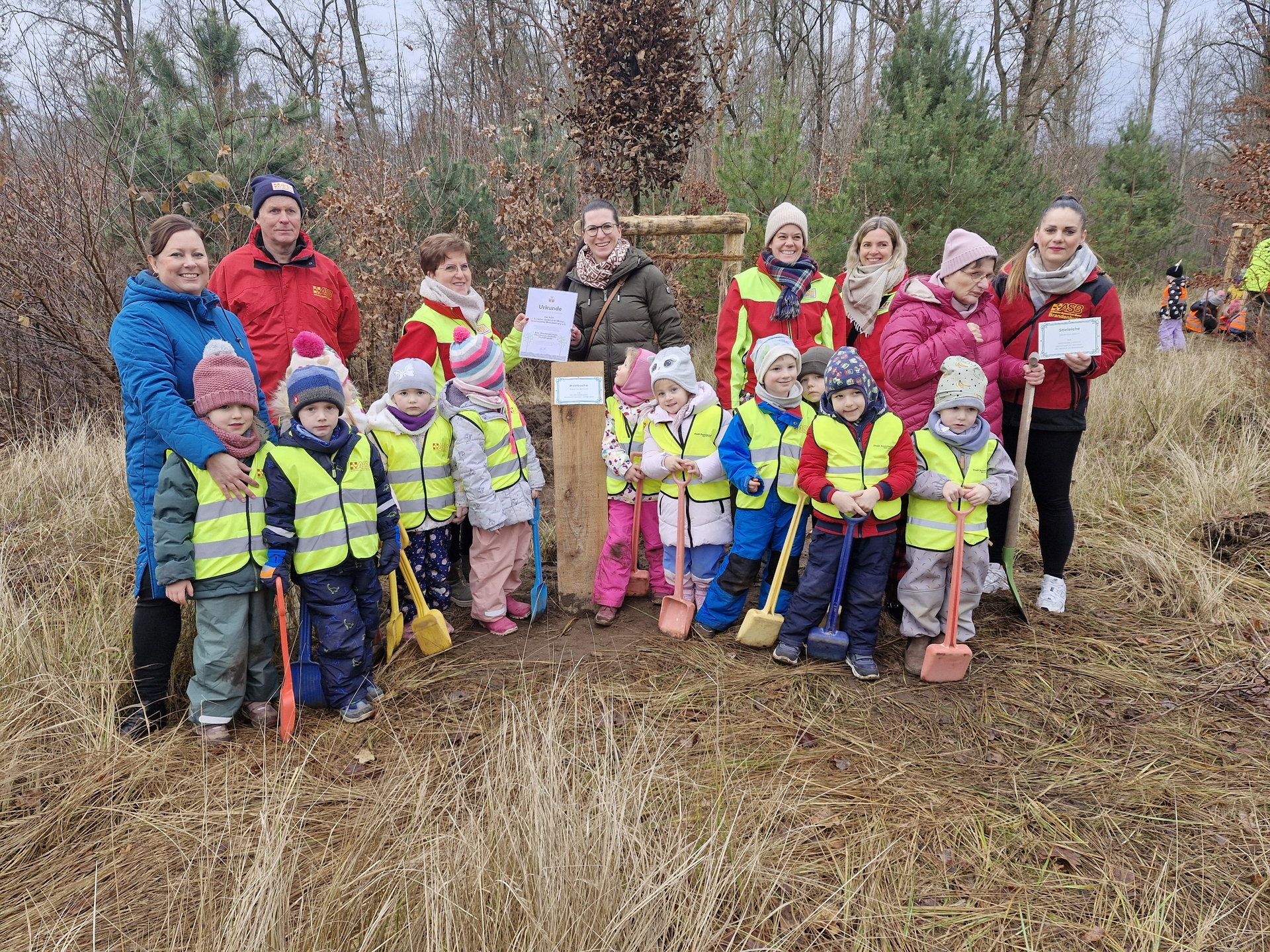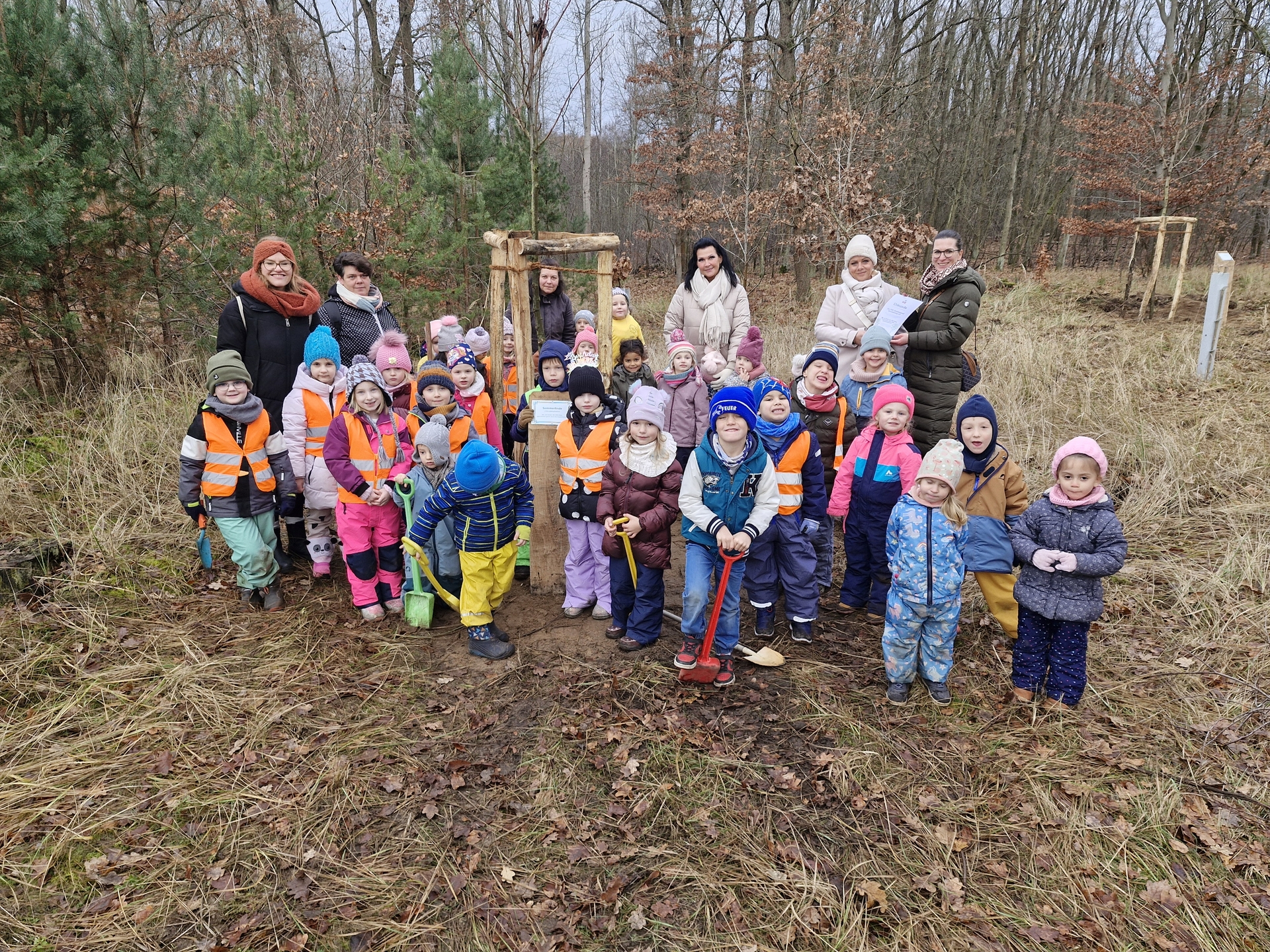 Am darauffolgenden Montag, dem 2. Dezember 2024, trat nun auch der Nachwuchs aus mehreren Brandenburger Kitas in Aktion. Verschiedene soziale Einrichtungen und Kindertagesstätten bzw. deren Träger haben sich dazu entschlossen, den städtischen Bürgerwald durch eine oder auch mehrere Baumpatenschaften weiter wachsen zu lassen.