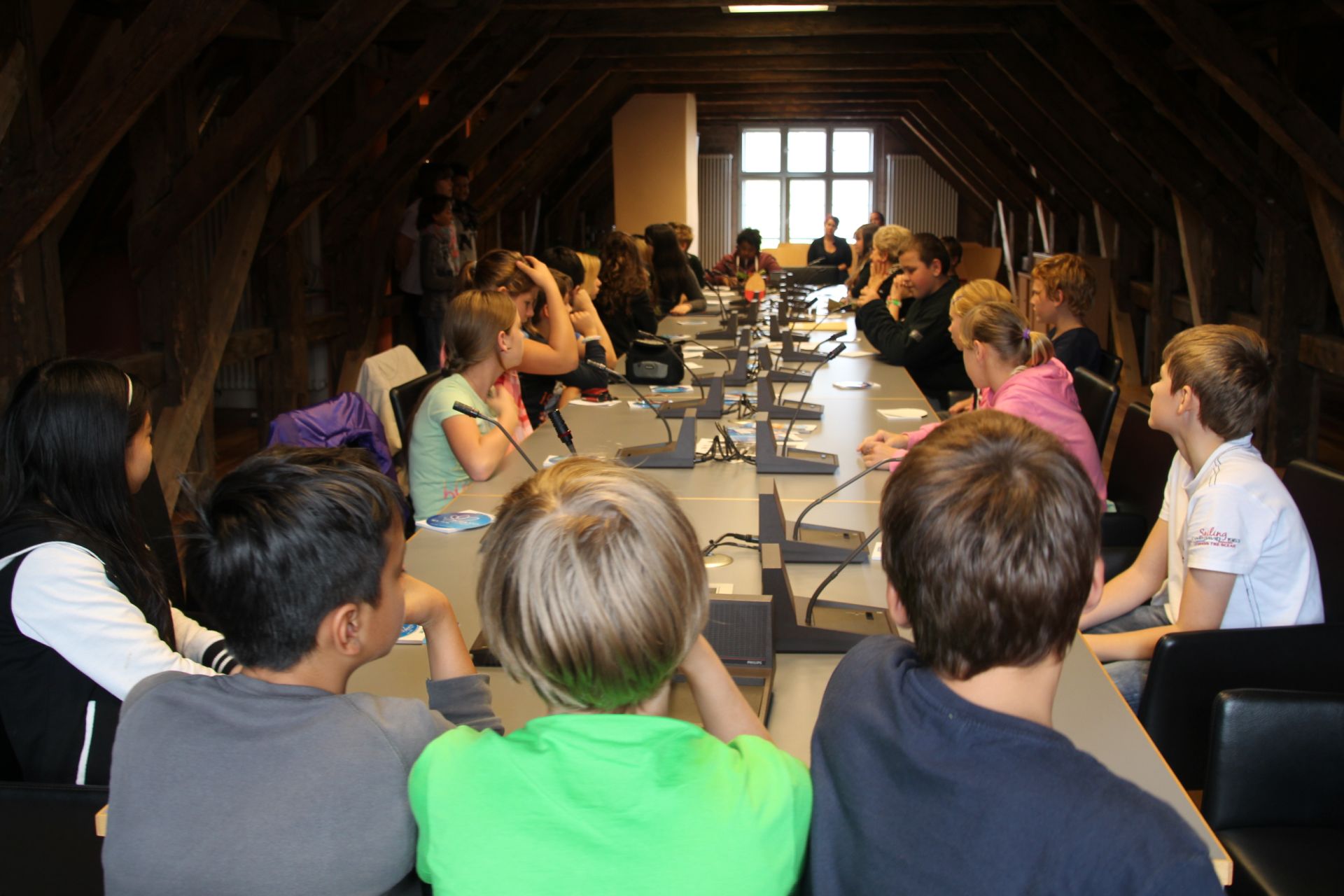 Oberbürgermeisterin Dr. Dietlind Tiemann empfing 30 Schülerinnen und Schüler der Gebrüder-Grimm Grundschule, die im Rahmen eines Klassenprojektes Gedichte über das BUGA-Maskottchen Wilma Wels verfasst haben.