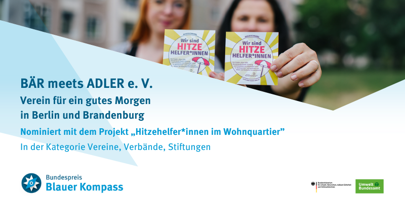 Das Projekt „Hitze-Helfer*innen im Wohnquartier“ ist für den Bundespreis „Blauer Kompass“ nominiert und konkurriert ab sofort um den Community-Preis, der auch mit einem Preisgeld i.H.v. 25.000 Euro dotiert ist.