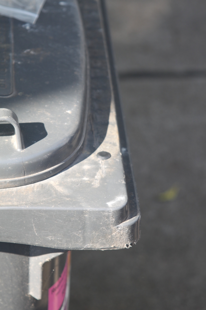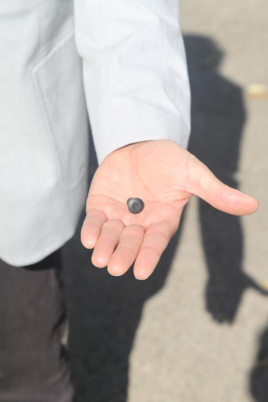 Auf den Fotos ist eine Tonne, die bereits einen Chip erhalten hat, dargestellt. Der Chip befindet sich auf dem oberen Tonnenrand außerhalb des Deckels (Durchmesser ca. 1cm) und sieht aus wie ein verblendeter Schraubenkopf bzw. eine Niete.