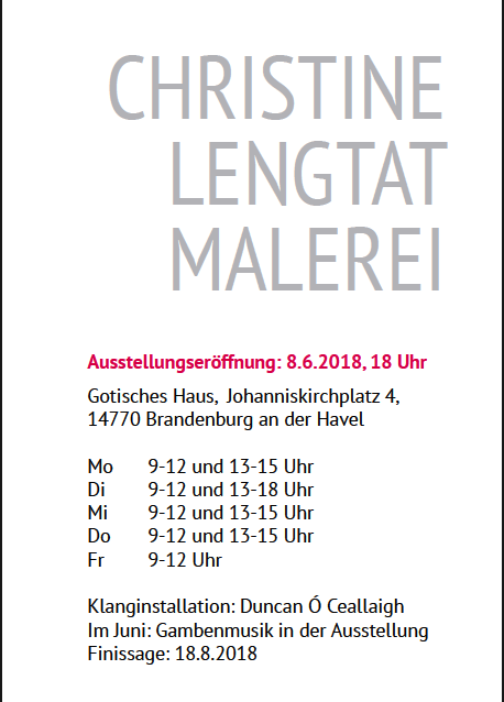 Zur Vernissage der Kunstausstellung „EXHIBIT #1“ der Künstlerin Christine Lengtat wird am Freitag, dem 08.06.2017, um 18:00 Uhr, in das Gotische Haus, Johanniskirchplatz 4, eingeladen.
