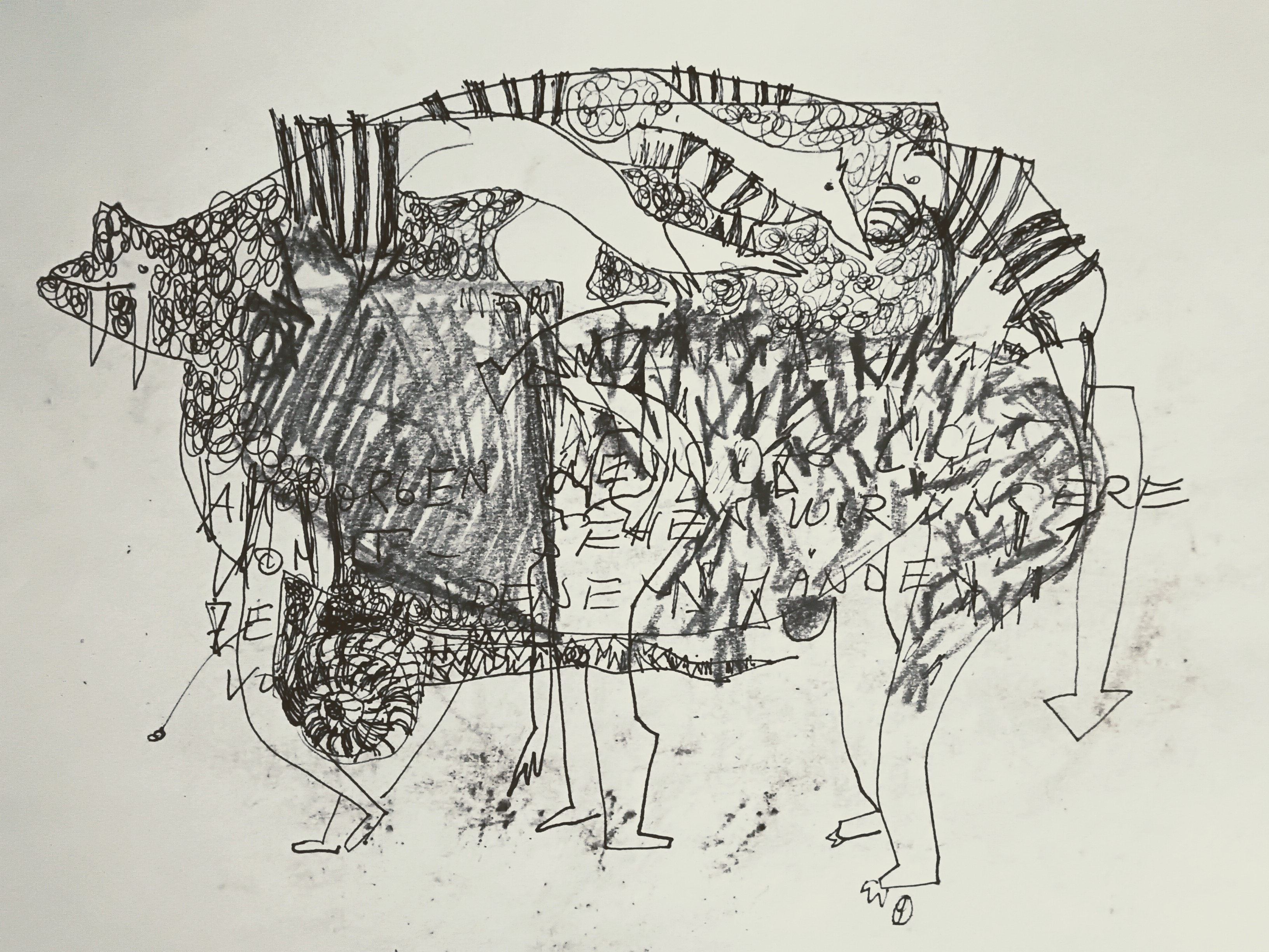 „Liebe Besucher, Besucherinnen, tretet auf die Kunst -, die keine ist...? Oder vielleicht doch? Die Sätze am Boden sind jedenfalls das Gerüst meiner Zeichnungen. Sie sind verborgen und versteckt, trotzdem da und wichtig. Sie liegen da, sichtbar gemacht zum Lesen, aber nicht zum ganz Verstehen. Wie Sätze, die aus Träumen uns nachhallen und über die wir lange rätseln. Wie hoffentlich meine Zeichnungen und Bilder.“