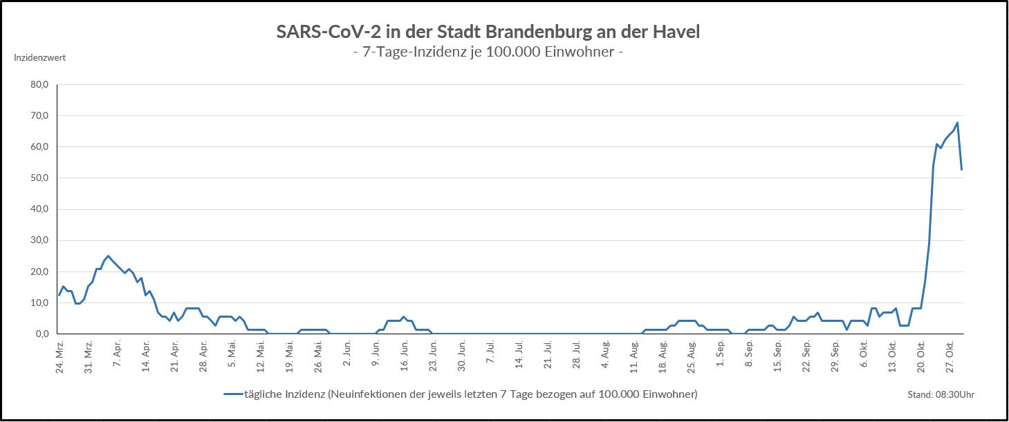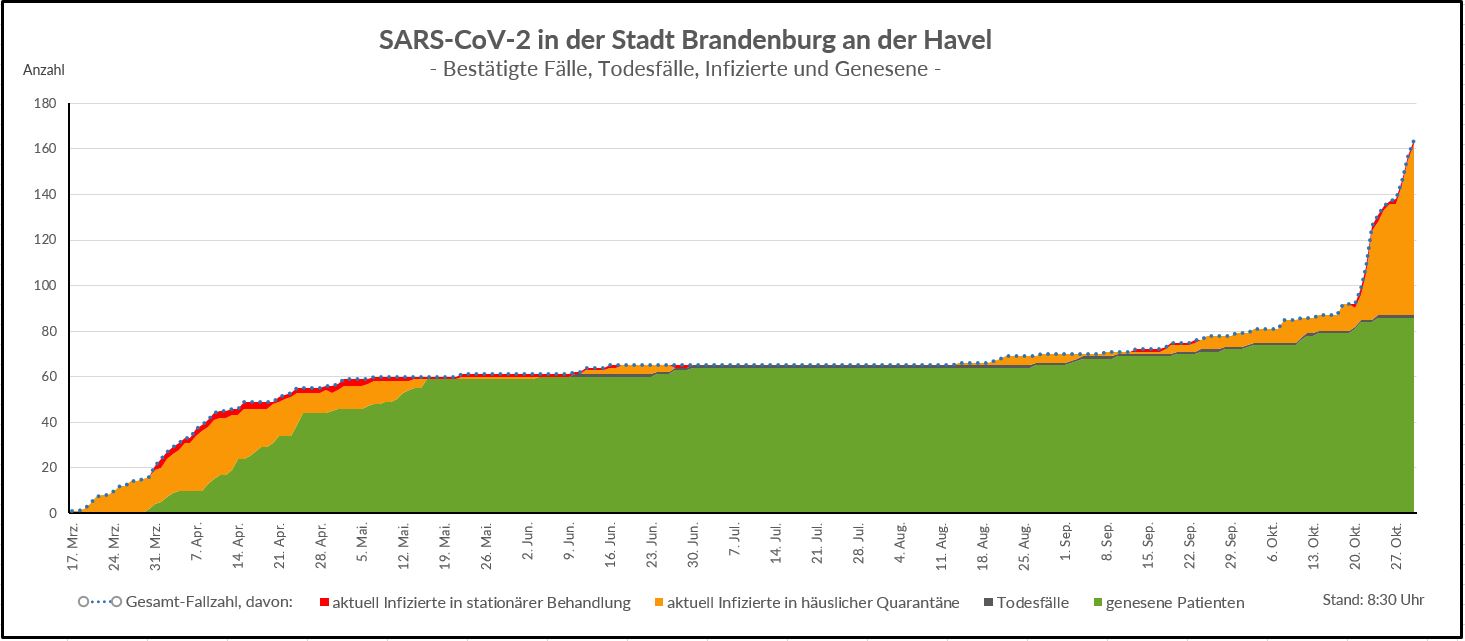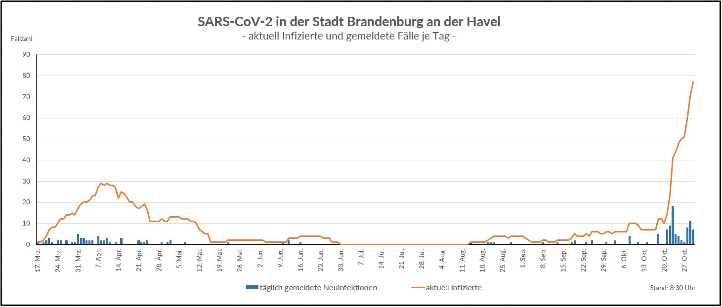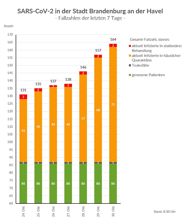 Das Gesundheitsamt der Stadt Brandenburg an der Havel informiert über die aktuellen SARS-CoV-2-Fallzahlen in der Stadt Brandenburg an der Havel, Stand: 30.10.2020, 08:30 Uhr: