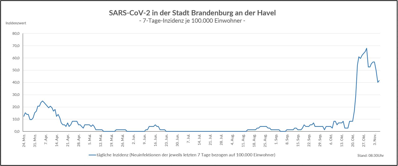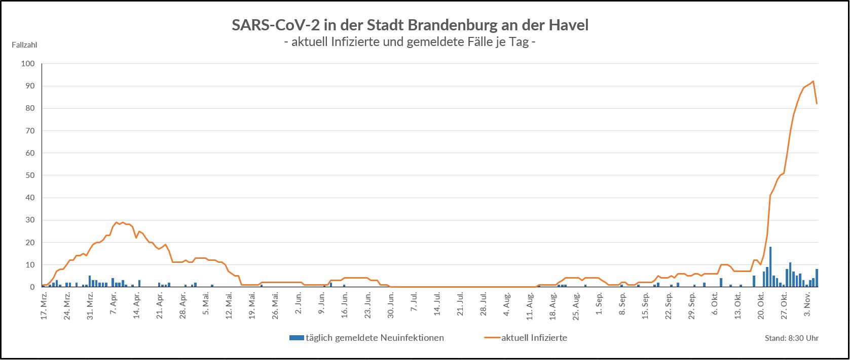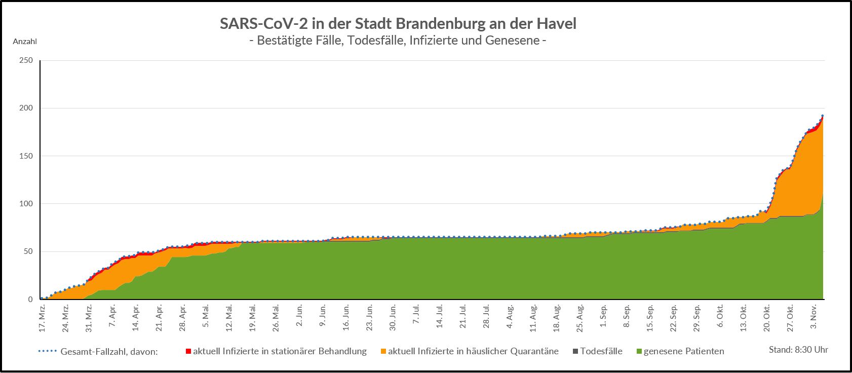 Das Gesundheitsamt der Stadt Brandenburg an der Havel informiert über die aktuellen SARS-CoV-2-Fallzahlen in der Stadt Brandenburg an der Havel, Stand: 06.11.2020, 08:30 Uhr: