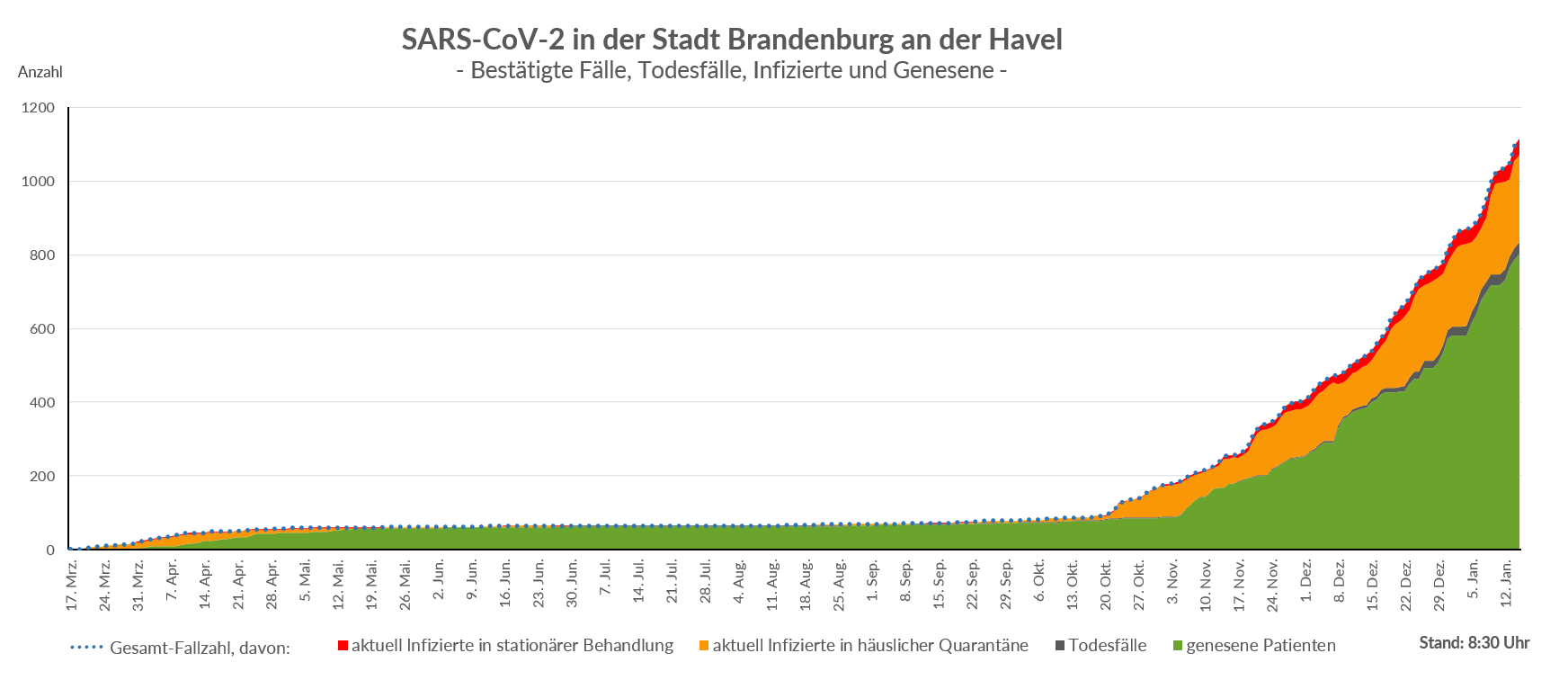 Das Gesundheitsamt der Stadt Brandenburg an der Havel informiert über die aktuellen SARS-CoV-2-Fallzahlen in der Stadt Brandenburg an der Havel, Stand: 15.01.2021, 08:30 Uhr: