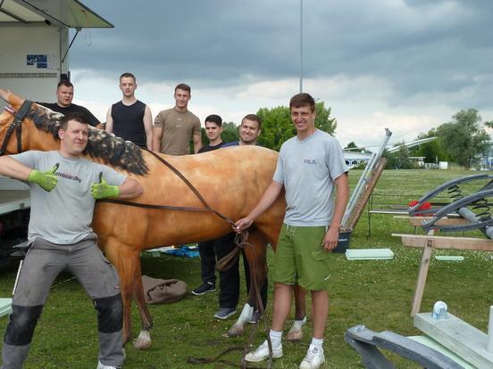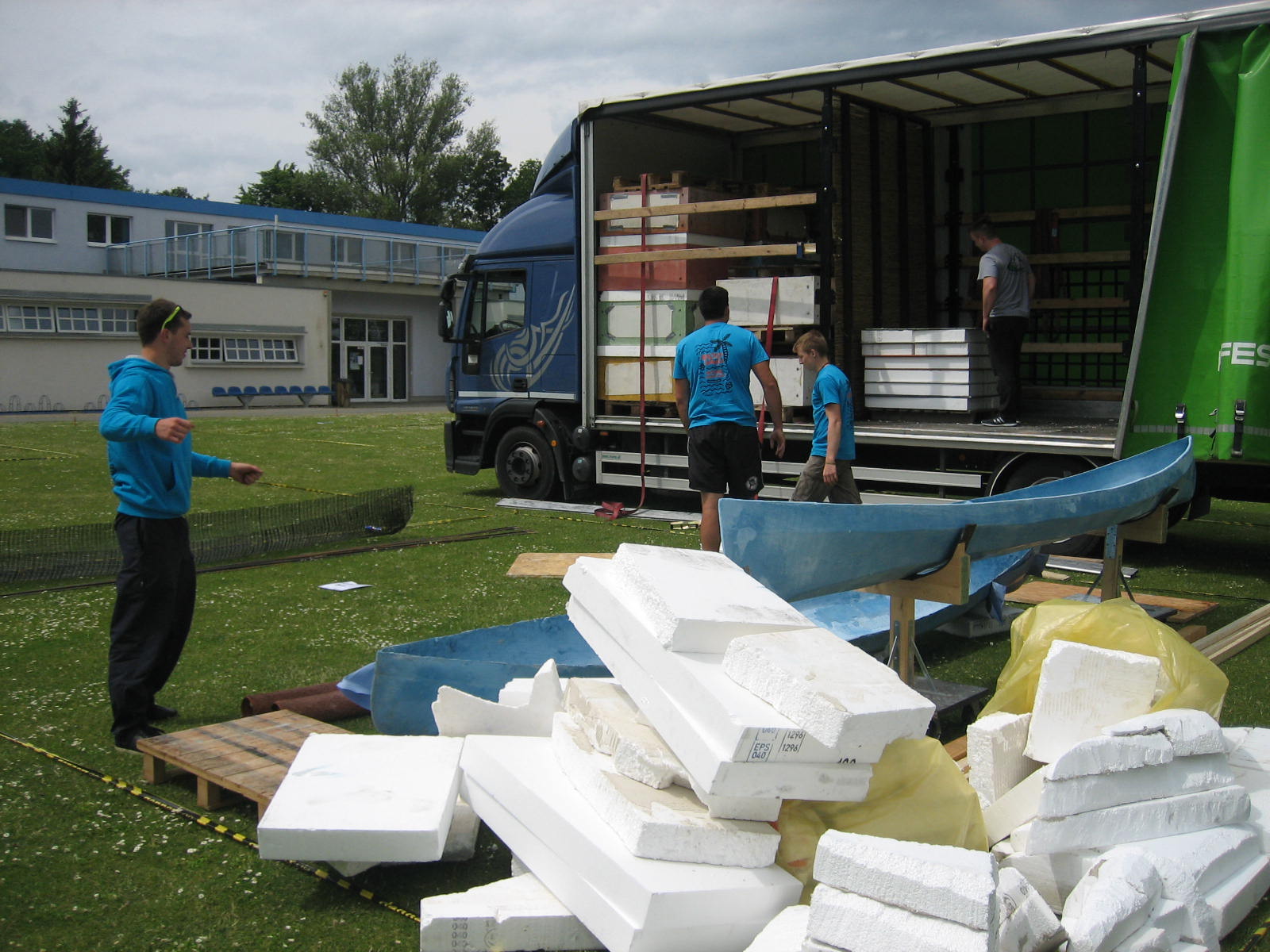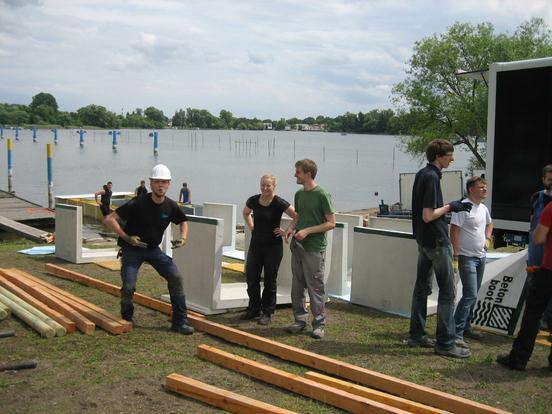 Die Studenten-Teams von der BTU Cottbus, der Uni Dresden und der HTWG Konstanz waren die ersten Teams, die am Donnerstagmittag auf dem Gelände der Regattastrecke „Beetzsee“ eintrafen. Während die Cottbuser sich sofort an das Entladen ihres LKW machten und damit begannen, aus vielen Einzelteilen ihre berühmte Postkutsche in Originalgröße zusammen zu bauen, überlegten die Studentinnen und Studenten aus der Elbmetropole noch eine Weile, wie sie ihren Schaufelraddampfer am besten zu Wasser lassen können. Denn das ist nicht so einfach, da es sich dabei nicht um Holz- oder Plastikboote sondern um tonnenschwere Betonkonstruktionen handelt.