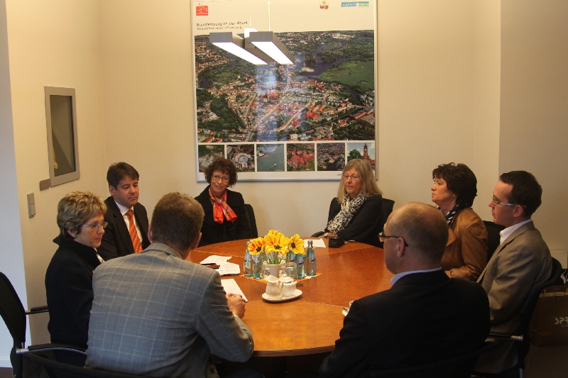 Dr. Dietlind Tiemann hat am Donnerstag, 02.05.2013, ihren Amtskollegen Jesper Würtzen sowie die drei weiteren Mitglieder einer Delegation aus der dänischen Stadt Ballerup begrüßt, die derzeit in Brandenburg an der Havel weilt. Bei einem Gespräch in ihrem Büro, an dem auch Bürgermeister Steffen Scheller und die für Schulen zuständige Fachbereichsleiterin Viola Cohnen teilnahmen, informierte die Oberbürgermeisterin die Gäste über Geschichte und Gegenwart der Havelstadt und erläuterte den Aufbau der Brandenburger Kommunalverwaltung. Im Anschluss daran wurde bei einem gemeinsamen Rundgang durchs Rathaus der sanierte und zum Verwaltungssitz umgebaute historische Gebäudekomplex im Herzen der Altstadt besichtigt.