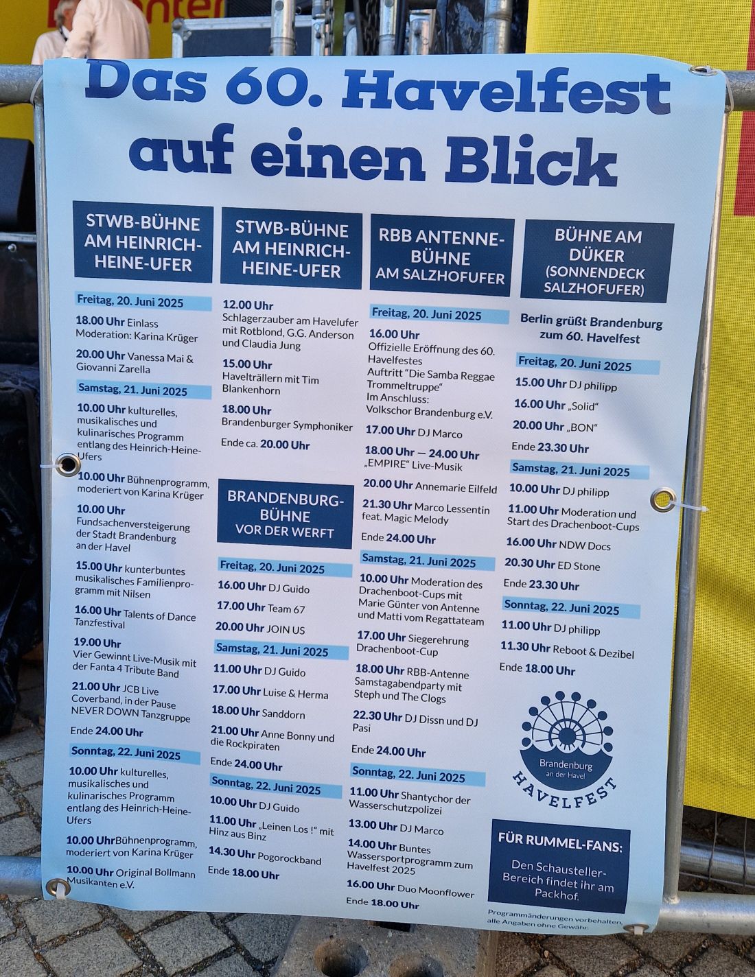 Die Stargäste des Eröffnungstages sind ab 20:00 Uhr (Einlass ab 18:00 Uhr) auf der Stadtwerke-Bühne am Heinrich-Heine-Ufer Vanessa Mai und Giovanni Zarella, wofür bis 20:00 Uhr der Ticketverkauf im StWB-Kundencenter, Packhofstraße 31, eingerichtet ist. Derweilen sind auf der Bühne am Düker eine AC/DC-Show mit „Bon“ (21:00 Uhr) und auf der Bühne vor der Werft nach „Team 67“ (ab 17:00 Uhr) Rock und Pop mit „Join us“ (20:00 Uhr) zu erleben. Die zweite große Bühne, die am Salzhof der RBB und Antenne Brandenburg bespielen, warten nach der Eröffnung mit der Coverband „Empire“ (18:00 – 24:00 Uhr) und zwischendurch mit Annemarie Eilfeld (20:00 Uhr) sowie Marco Lessentin feat. Magic Melody (21:30 Uhr) auf.
