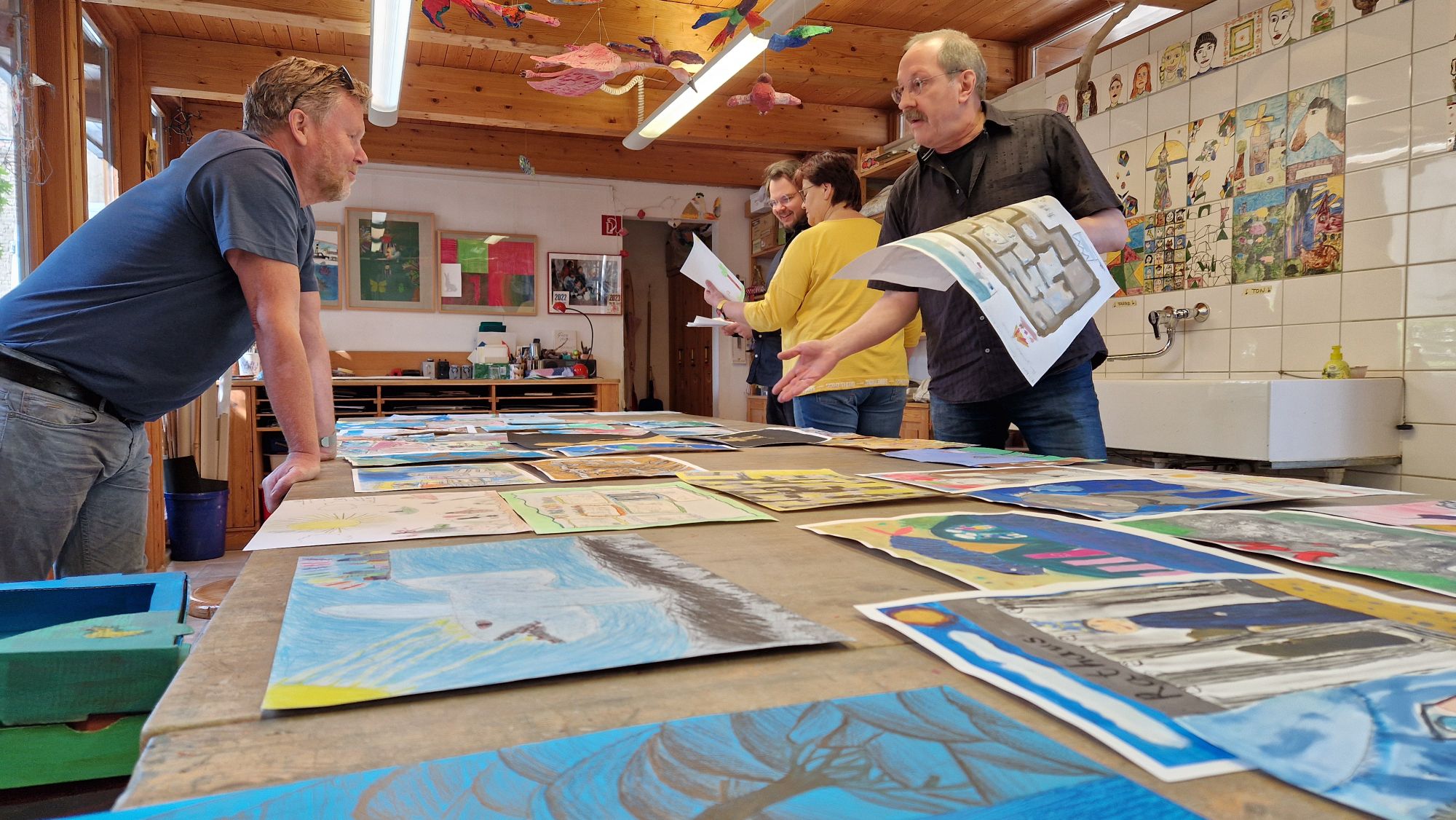 Der 20. „Undine“-Wettbewerb für neue Märchen steht kurz vor seinem bunten Ende. Doch bevor am 16. Juni im Rahmen der zweiten Märchen-Matinee die besten bildenden der märchenliebenden Künstlerinnen und Künstler ausgezeichnet werden können, galt es ihre Werke zu bestaunen und zu beurteilen. Dafür vereinte sich die fünfköpfige Jury unter dem Vorsitz von Thomas Bartel wieder in der Kinder- und Jugend-Kunst-Galerie „Sonnensegel“, um sich über die bildkünstlerischen Beiträge dieses „Undine“-Jahrgangs auszutauschen. Mit dabei waren Tobias Öchsle, der Direktor der Wredow’schen Zeichenschule, „Sonnensegel“-Leiter Matthias Frohl, Fouqué-Bibliothek-Direktorin Cornelia Stabrodt und Stadt-Pressesprecher Thomas Messerschmidt. Zu bewerten waren 218 bildkünstlerische Werke, die zu den 14 ausgezeichneten der 219 eingereichten Märchen entstanden waren. Die Jury besichtigte sie einen kunstvollen Vormittag lang und verständigte sich auf zehn Preisträgerinnen und Preisträger.