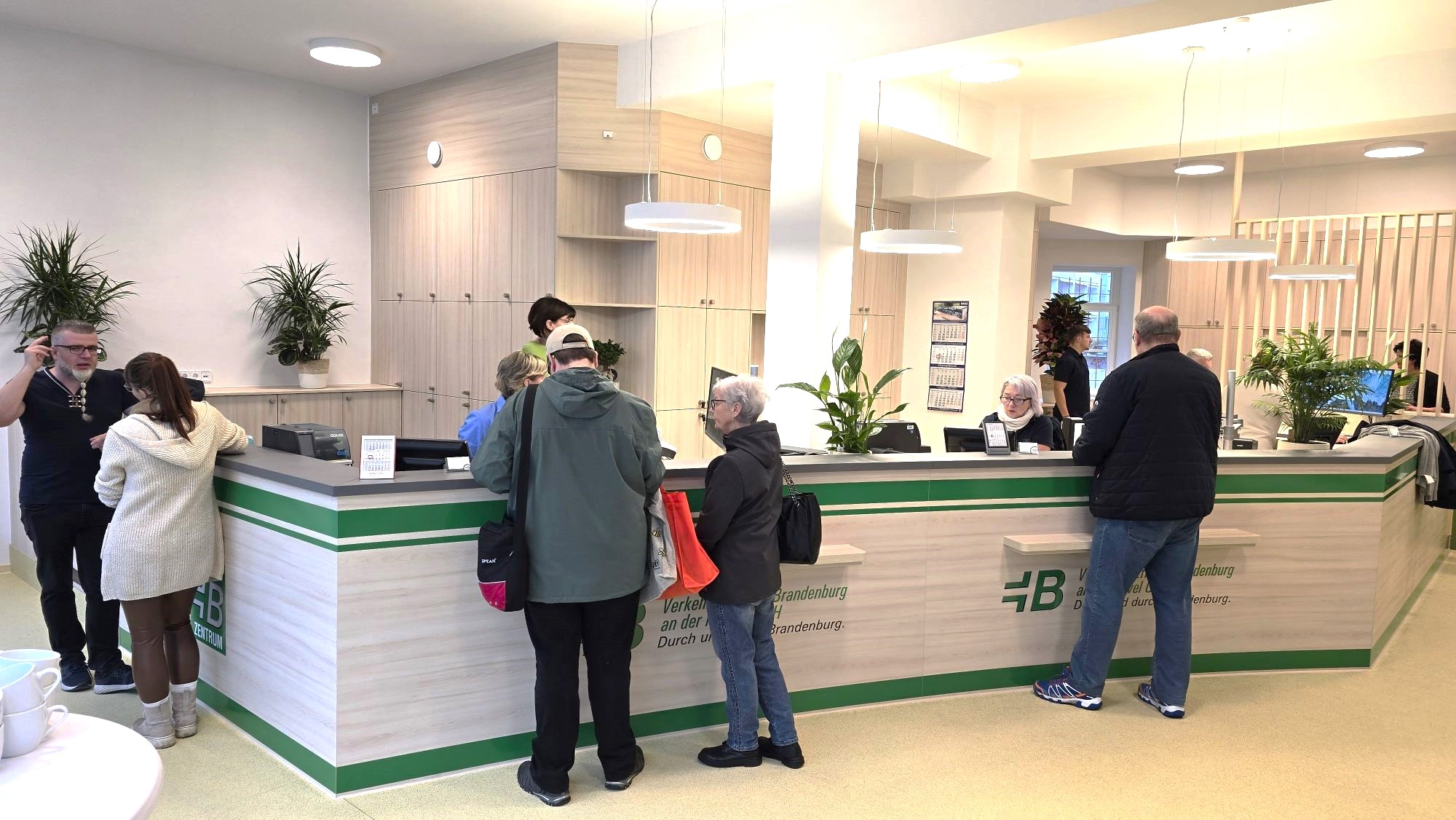 Das neue Fahrgastzentrum, das hinter dreifach verglasten Schaufenstern strahlt, ist indes schon am Start. Ein modernes Licht- und Lüftungskonzept sorgt für angenehme Bedingungen und der Empfangs-Tresen ist ein Schmuckstück.