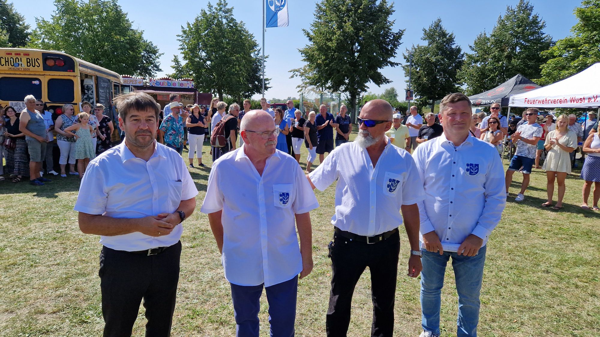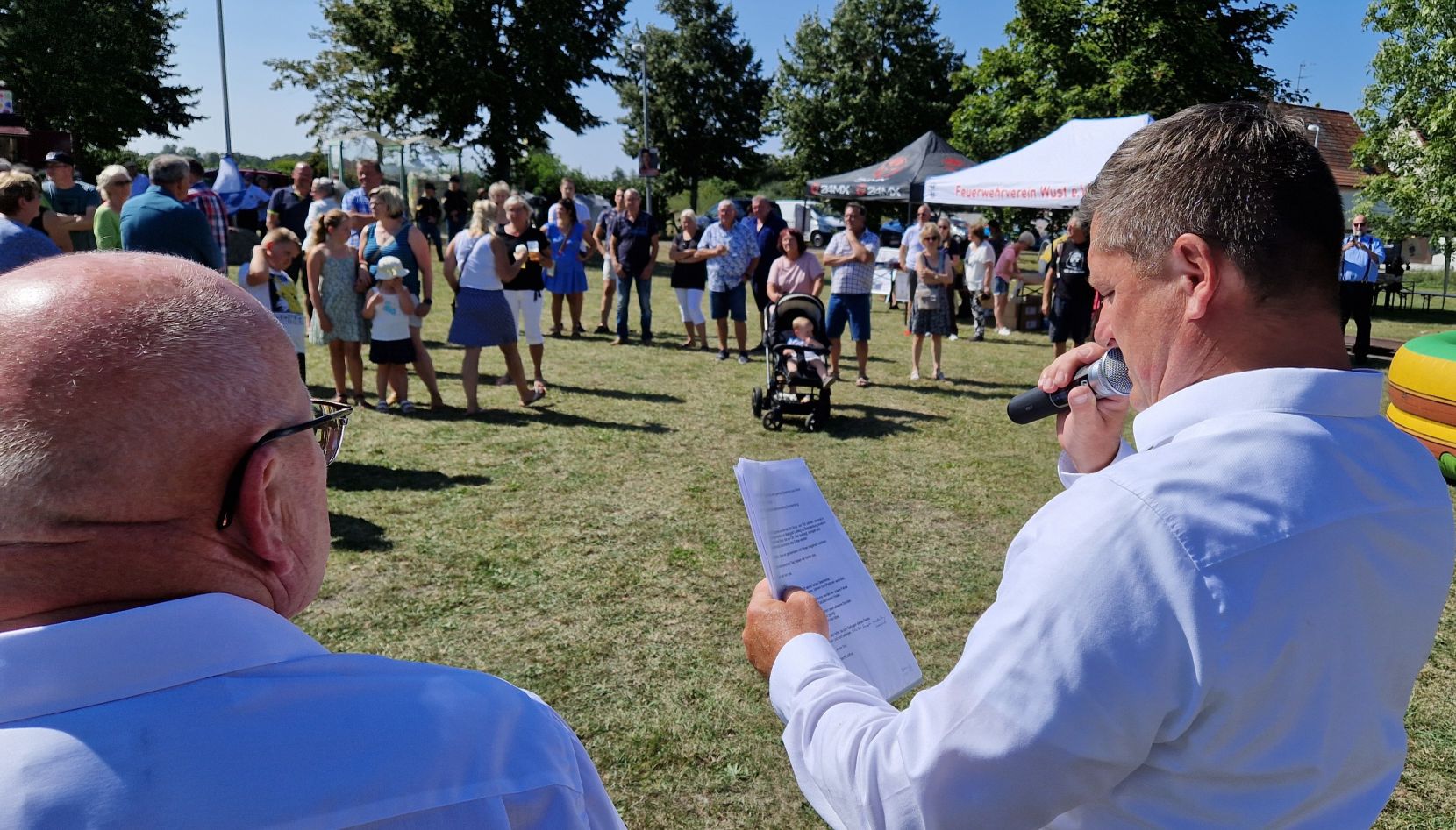 Den guten Botschaften und Gesängen folgte der gemeinsame Weg zum Festplatz, wo Ortsvorsteher Bodo Kassau mit André Borbély, dem Vorsitzenden des rührigen Festkomitees, und im Beisein von Oberbürgermeister Steffen Scheller das Fest eröffnete. Dazu gehörte auch das Hissen der Fahne mit dem neuen Ortswappen, dass sich die jubilierenden Wuster sozusagen selbst geschenkt haben. Wappengestalter Mathias Kriesel hatte dafür das für die Neustadt Brandenburg stehende Blau, die aus dem Ortsnamen hervorgehende Distel und zwei für den ortsbildprägenden Torf- und Tonabbau stehende Spatenblätter vereinigt.