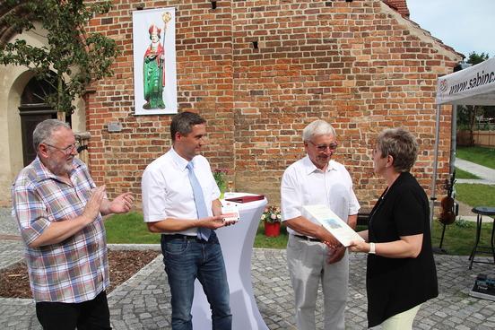 Die St. Nikolaikirche in Treuenbrietzen wurde am Mittwoch, 30.08.2017, zum Denkmal des Monats August von der Arbeitsgemeinschaft (AG) Städte mit historischen Stadtkernen ausgezeichnet. Dr. Dietlind Tiemann, Vorsitzende der Regionalgruppe Süd-West der AG Städte mit historischen Stadtkernen und Oberbürgermeisterin der Stadt Brandenburg an der Havel überreichte gemeinsam mit dem Vorsitzenden der AG und Bürgermeister von Treunbrietzen, Michael Knape, die Urkunde und Plakette an Kirchenvorstand Günter Gundlach.